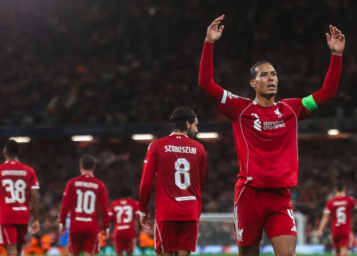Virgil Van Dijk, con los brazos arriba, festeja el tanto del triunfo del Liverpool. Foto: club Livepool