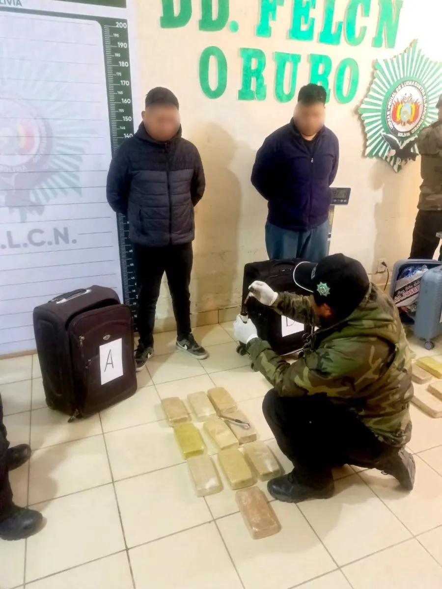 El hecho fue reportado desde la Terminal de Buses, donde se hallaron tres maletas con 15 kilos de droga en La Paz; los restantes 45 kilos fueron interceptados en la ciudad de Oruro.
