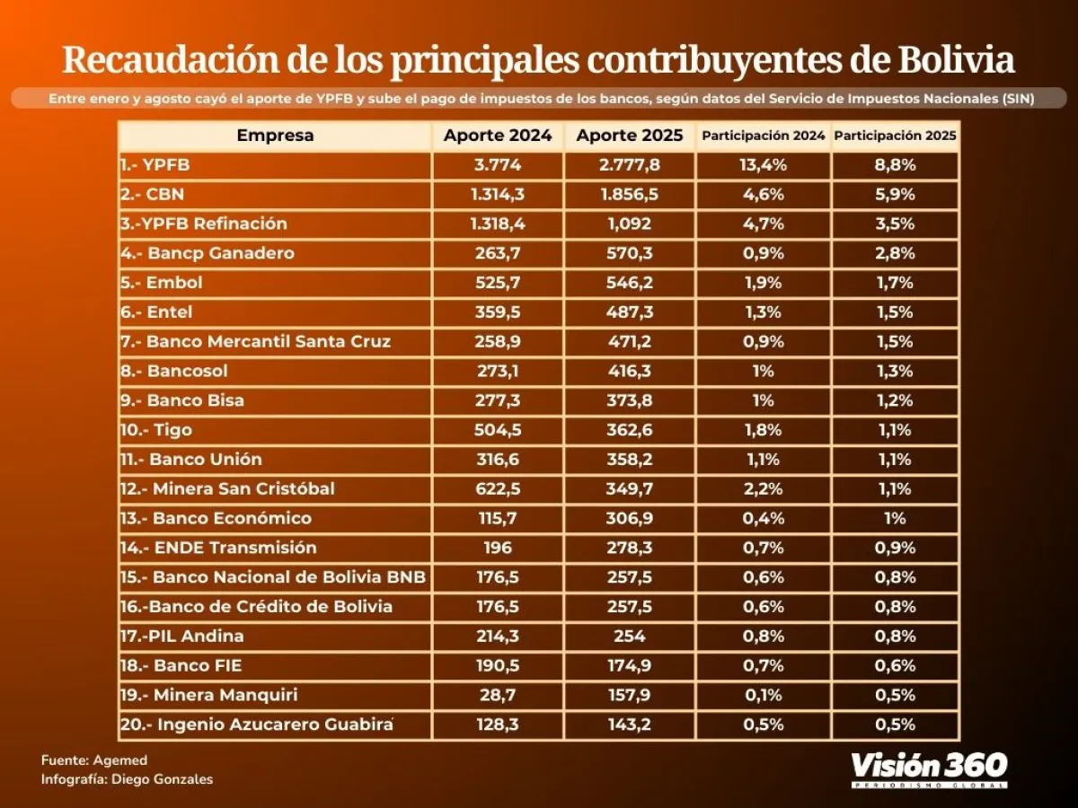 Yacimientos Petrolíferos Fiscales Bolivianos (YPFB, se mantiene como la empresa número uno en el pago de impuestos, pero su aporte bajo en los primeros 8 meses del año, mientras que los bancos aumentaron su contribución al Servicio de Impuestos Nacionales (SIN).
