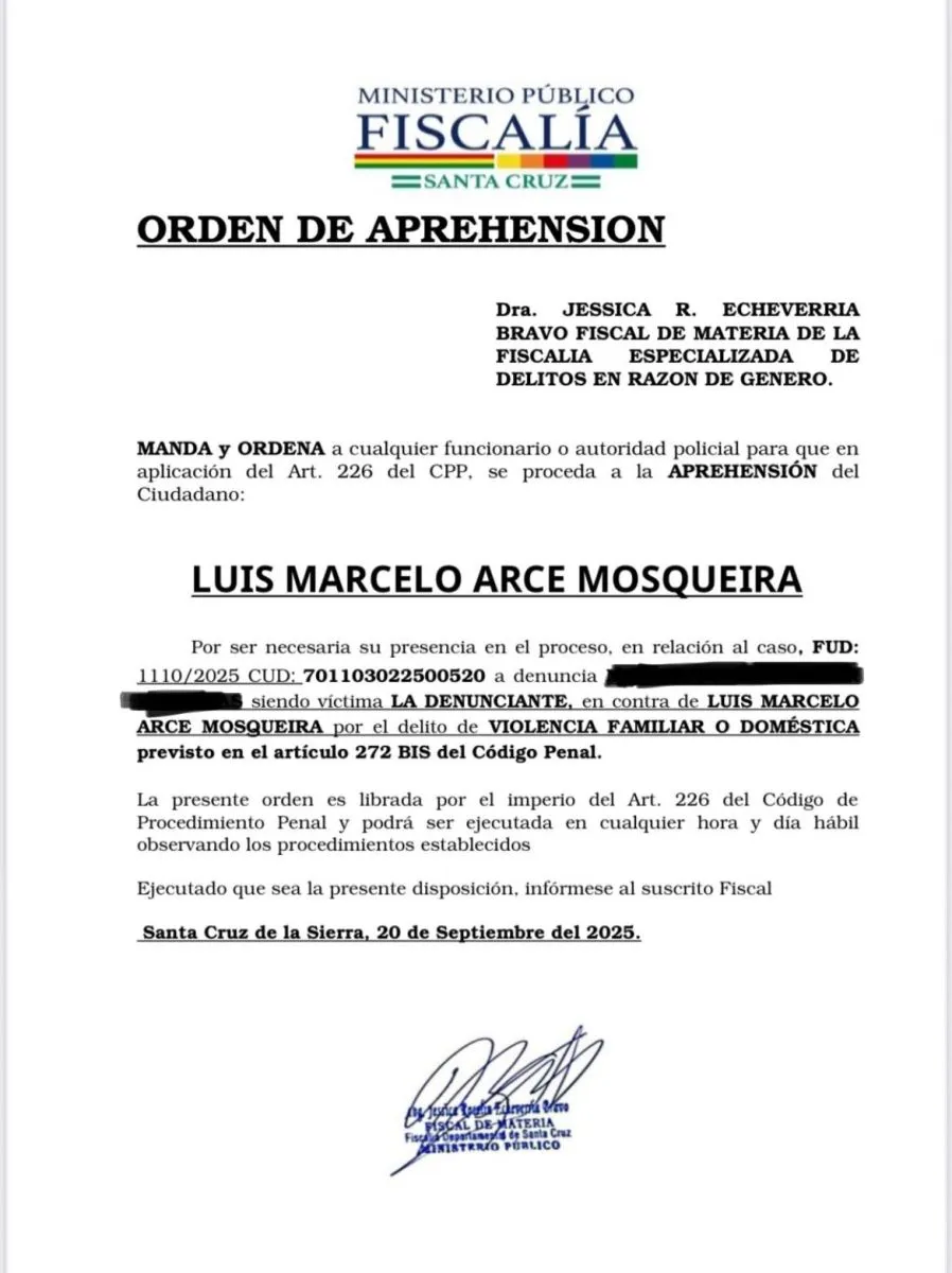 El Ministerio Público emitió este sábado 20 de septiembre una orden de aprehensión contra Luis Marcelo Arce Mosqueira, hijo del presidente Luis Arce Catacora, en el marco de un proceso abierto en su contra por violencia familiar.
