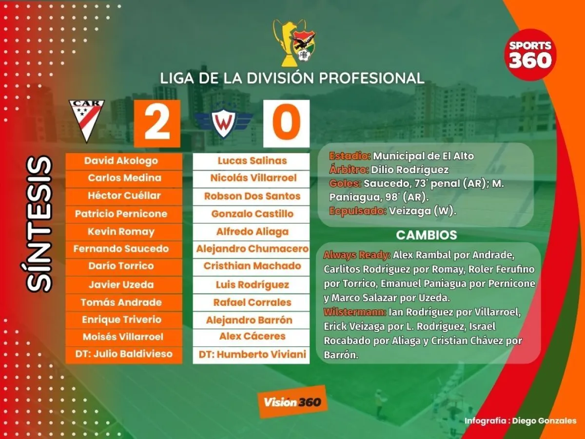 Always Ready sufrió más de la cuenta para ganarle a Wilstermann (2-0), partido de la jornada 21 que se jugó en la tarde-noche de este domingo en el estadio Municipal de El Alto, y se consolidó en el primer lugar de la Liga de la División Profesional.