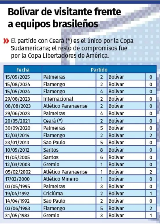 Bolívar no tiene un buen historial en sus visitas a Brasil por torneos internacionales. De los 20 partidos que jugó hasta el momento, ganó solo una vez, empató en otra ocasión y perdió en 18 oportunidades.