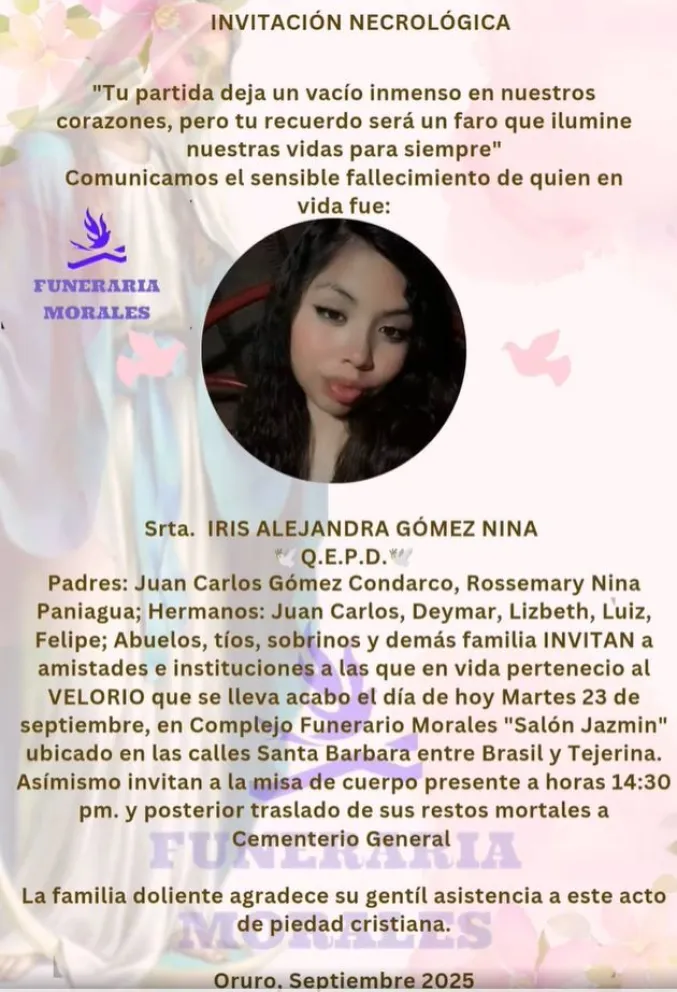 Iris Alejandra era la menor de cuatro hermanos, dos varones y una mujer, quienes ahora, junto a sus padres, llorar por su pérdida. “Tiene hermanos, es la menor, recién cumplió 18 años en marzo”.
