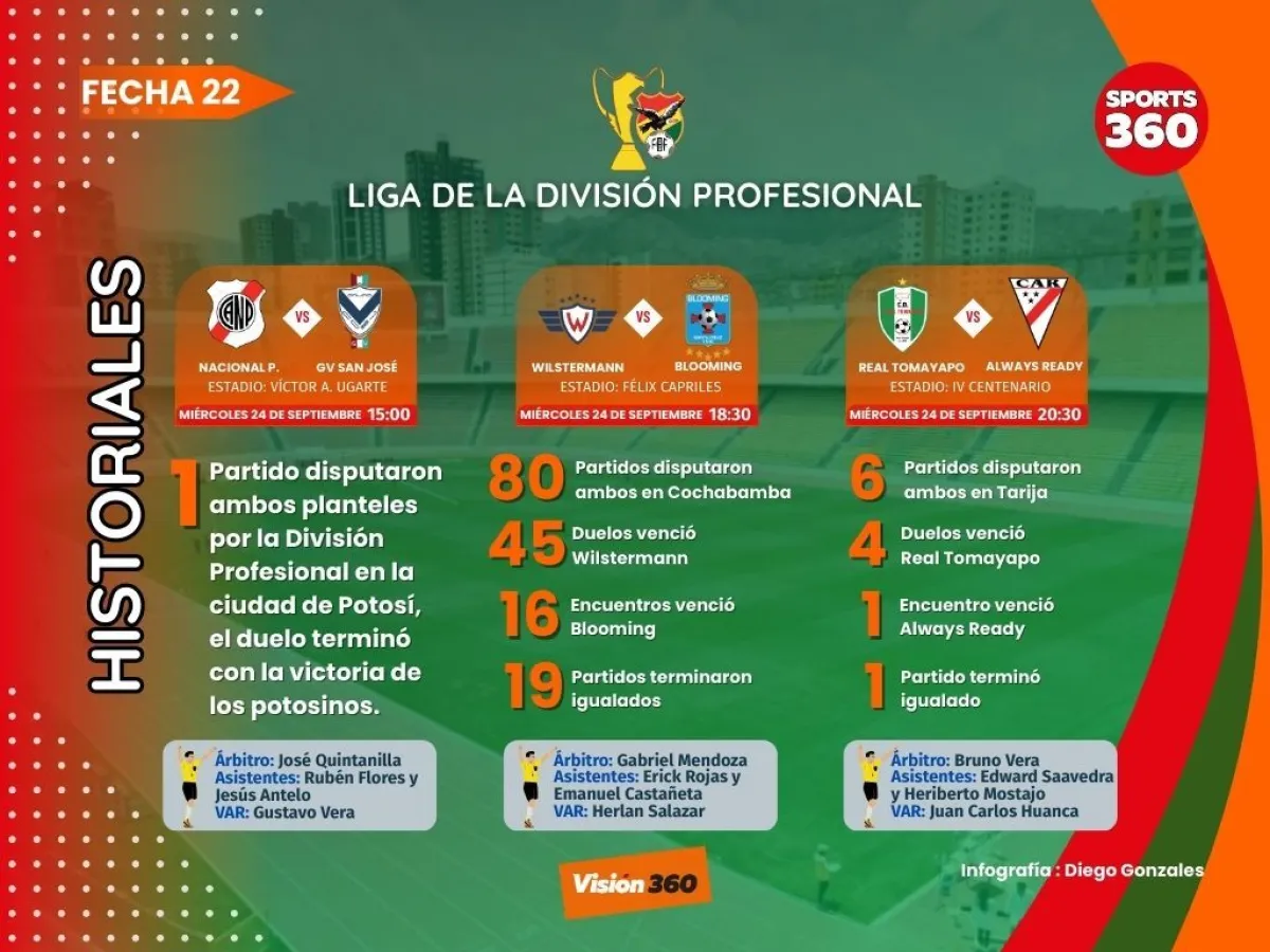 Los partidos de este miércoles empezarán en la Villa Imperial (15.00). El local Nacional Potosí, que ha sumado en sus dos últimos partidos, ambos como visitante —le ganó a Wilstermann en Cochabamba (2-5) y empató con Oriente en Santa Cruz (2-2)—, buscará mantenerse en racha ante GV San José.