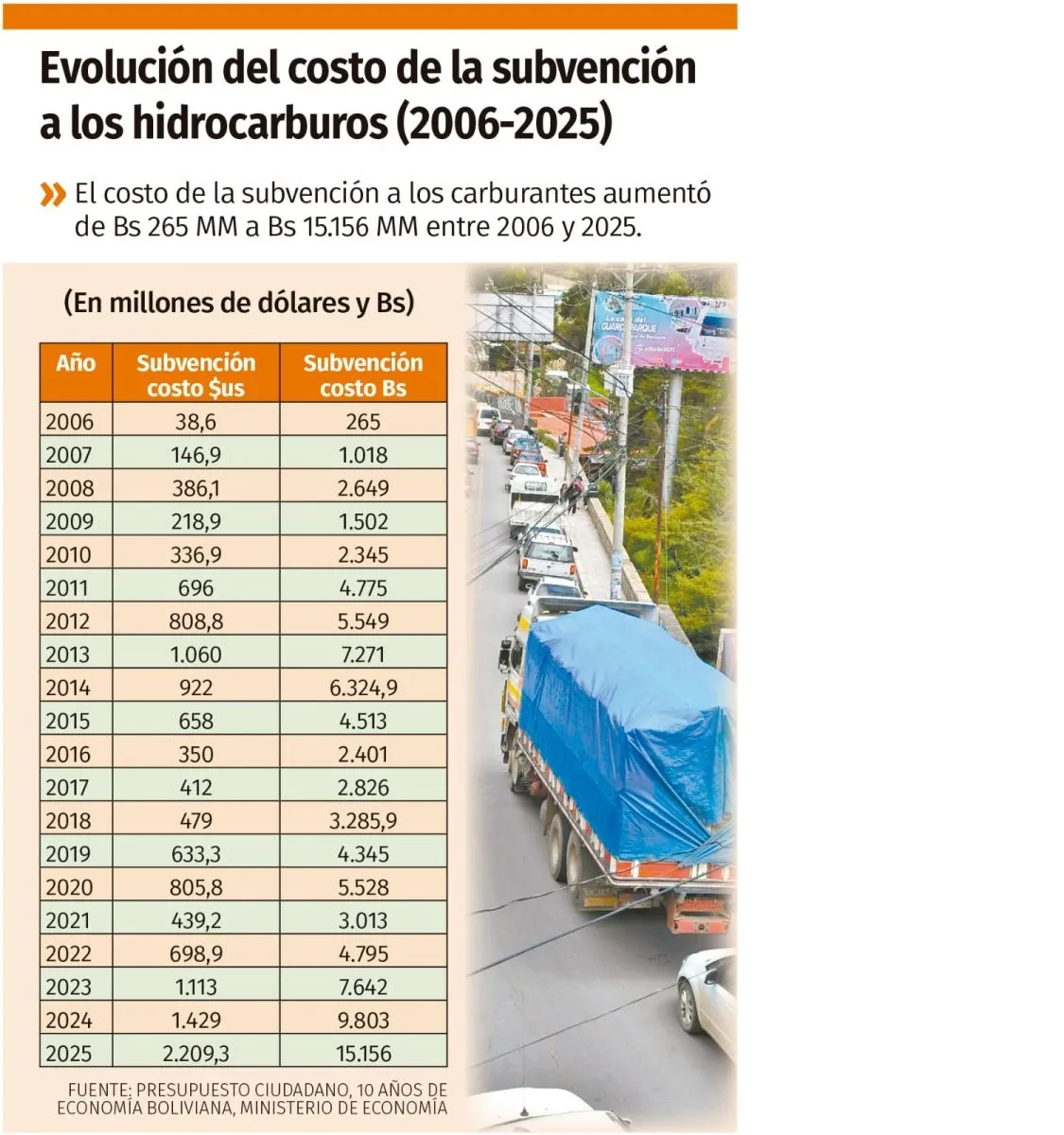 Entre 2006 y 2025, el subsidio a la gasolina y el diésel pasó de 265 millones de bolivianos a 15.156 millones de bolivianos, es decir en 5.619,2%. El Partido Demócrata Cristiano (PDC) y la alianza Libre en caso de llegar al Gobierno anuncian cambios en torno a esta política, ello luego de 20 años y ante el millonario gasto fiscal.