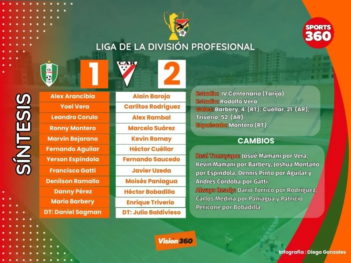 Always Ready le ganó este miércoles por 1-2 a Real Tomayapo en Tarija por la fecha 22 de la Liga de la División Profesional y se consolidó en el primer lugar de la tabla de posiciones.