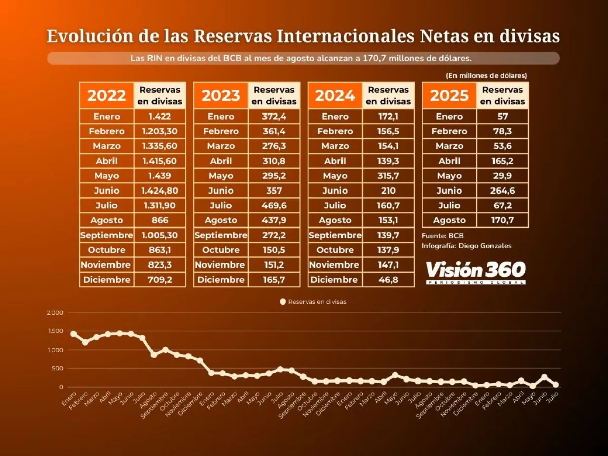 En junio de 2022, las RIN en divisas sumaban $us 1.424 millones y disminuyeron a $us 46,8 millones, en 2024; y este año subieron a $us 170,7 millones. Advierten que con los niveles actuales de las RIN, el tipo de cambio oficial de Bs 6,96 por dólar ya no tiene respaldo.