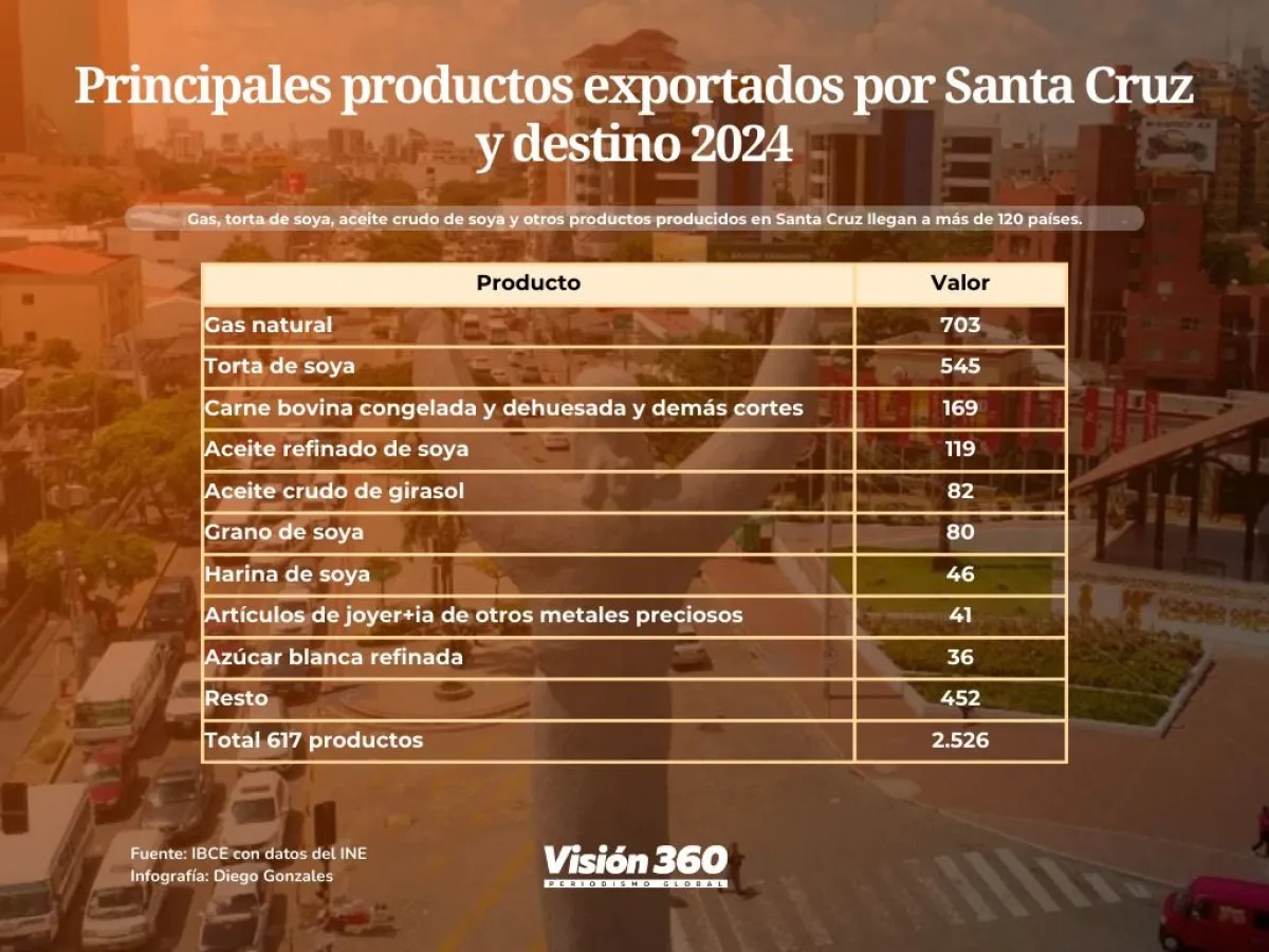 Los principales productos exportados por Santa Cruz son gas natural, soya y derivados, carne bovina, azúcar, artículos de joyería y otros que llegan a Colombia, Perú, Brasil, China, EEUU y hasta Angola.