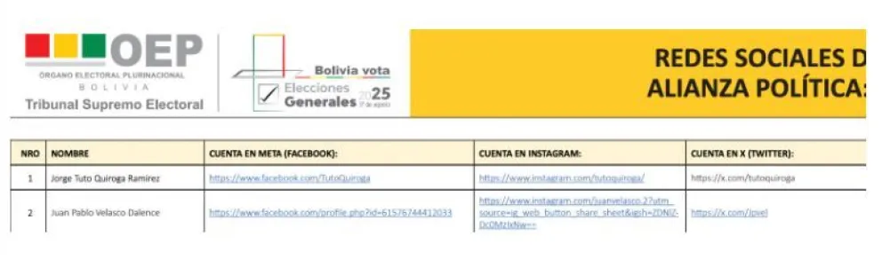En el proceso de verificación se pudo constatar que Juan Pablo Velasco registró la cuenta https://x.com/Jpvel como su perfil oficial en X ante el Tribunal Supremo Electoral (TSE), como se observa en la parte inferior derecha de esta imagen: