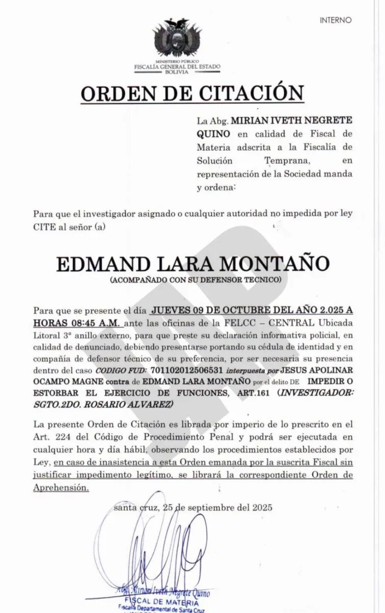 Lara deberá presentarse el próximo jueves 9 de octubre de 2025 a horas 8.45 en las oficinas de la Fuerza Especial de Lucha Contra el Crimen (Felcc) de Santa Cruz.