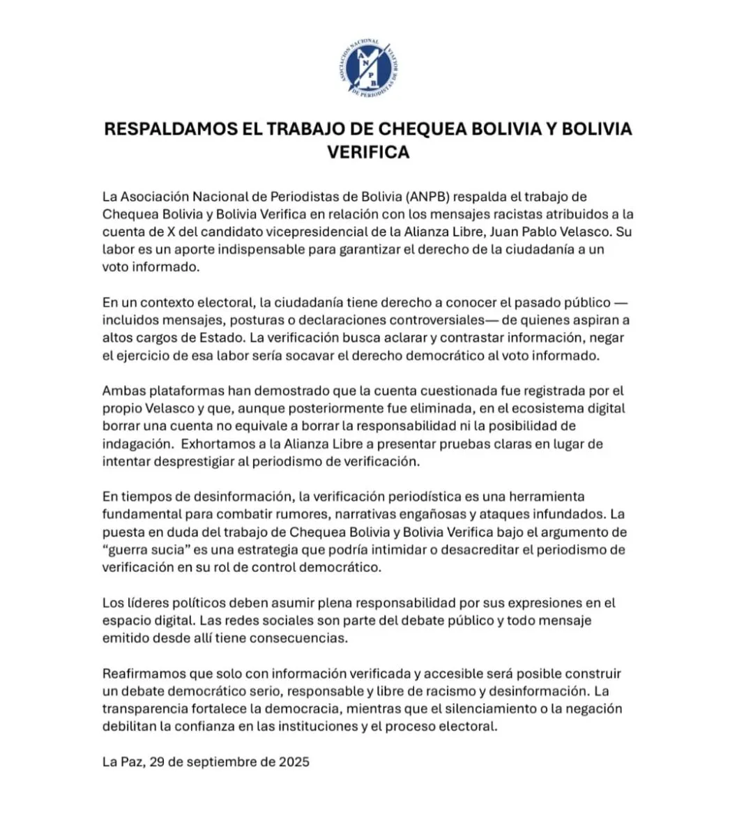 La Asociación Nacional de Periodistas de Bolivia (ANPB) respaldó este lunes el trabajo de Chequea Bolivia y Bolivia Verifica en relación con los mensajes racistas atribuidos a la cuenta de X del candidato vicepresidencial de la alianza Libre, Juan Pablo Velasco, y exhortó a la alianza Libre a “presentar pruebas claras en lugar de intentar desprestigiar al periodismo de verificación”.