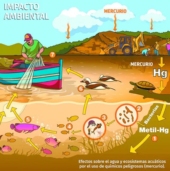 “Las empresas que explotan el metal precioso en el norte del país desechan el mercurio en los ríos, donde se acumula y contamina diferentes alimentos, que luego son consumidos por seres humanos”, explicó el director del Cedib, Óscar Campanini.