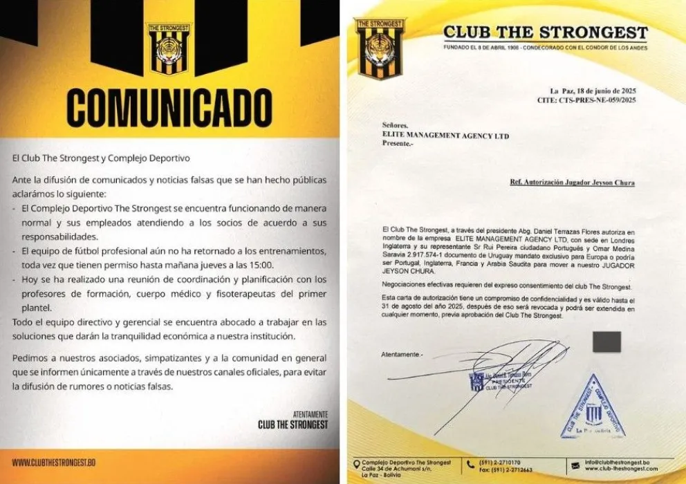Para no extendernos en el tema —aunque existen muchos casos más—, el martes 16 de este mes circuló en redes sociales un documento fechado el 18 de junio que dejaba constancia de que el presidente Terrazas firmó una “autorización” a la Agencia Elite Management LTD para que le busque club a Jeyson Chura, quien en reiteradas oportunidades expresó su intención de alejarse de la entidad.