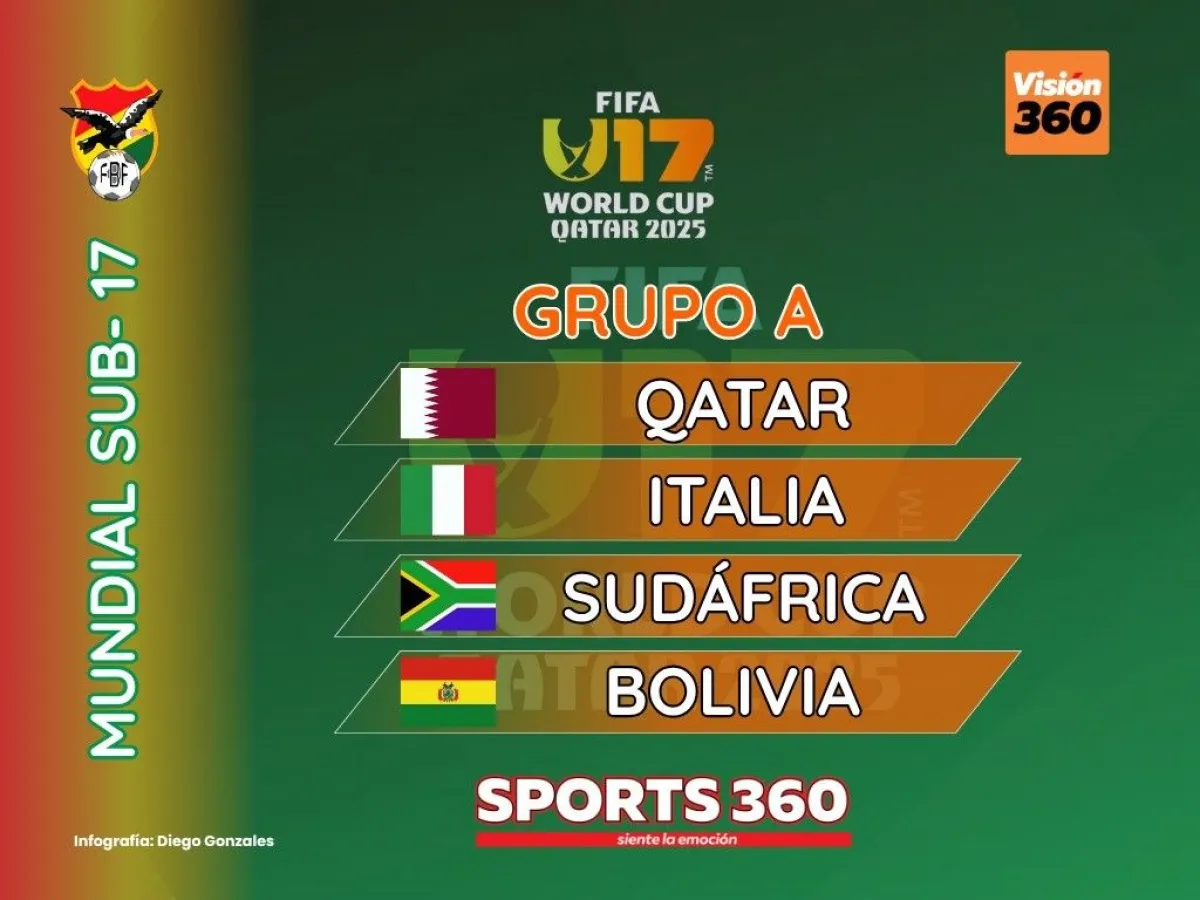 La Selección boliviana Sub 17 iniciará su participación en el Mundial de Qatar 2025 el lunes 3 de noviembre, a las 08.30 (hora boliviana), frente a Sudáfrica, en el marco del Grupo A del certamen juvenil, que completan Italia y la selección anfitriona.