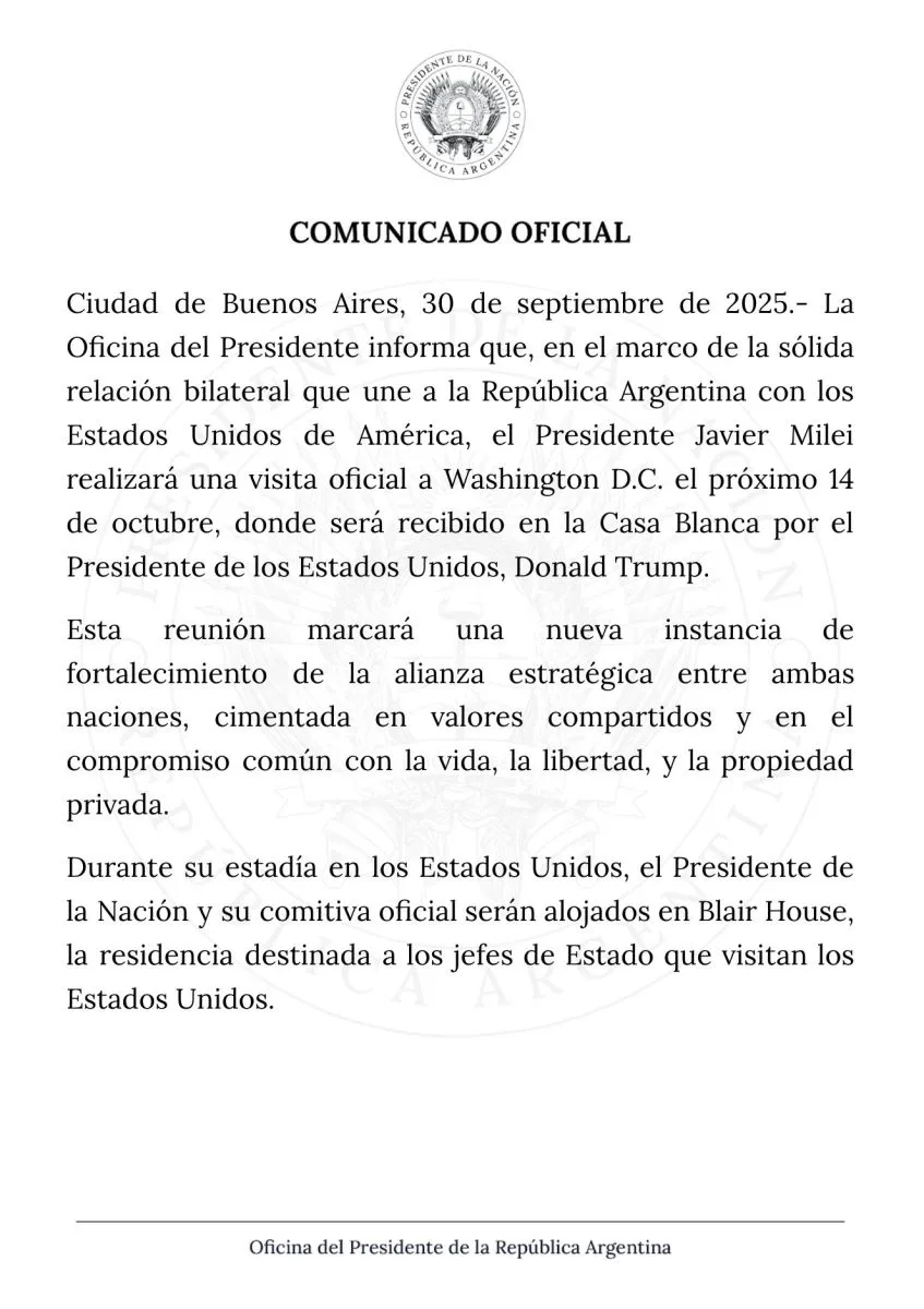 "En el marco de la sólida relación bilateral que une a la República Argentina con los Estados Unidos de América, el presidente Javier Milei realizará el próximo 14 de octubre una visita oficial a Washington, donde van a recibirlo en la Casa Blanca el presidente de los Estados Unidos, Donald Trump", anunció la Presidencia argentina en un comunicado.
