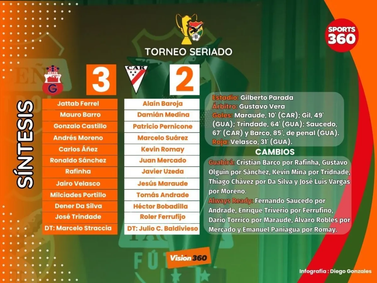 Tras un partidazo con cinco goles, Guabirá hizo respetar su localía al imponerse sobre Always Ready (3-2), este jueves en el estadio Gilberto Parada de Montero por la octava fecha de la Copa Bolivia y con ello se puso más líder que nunca del Grupo D.