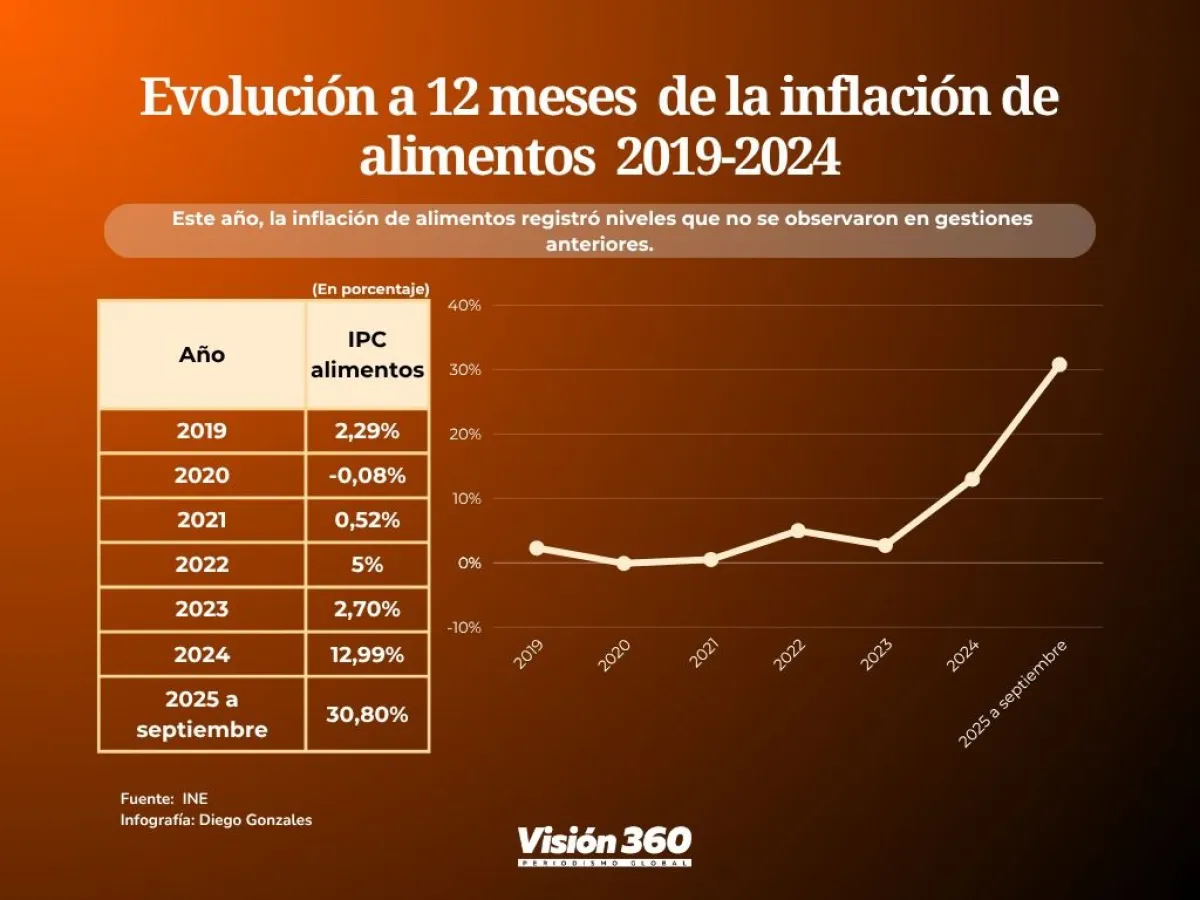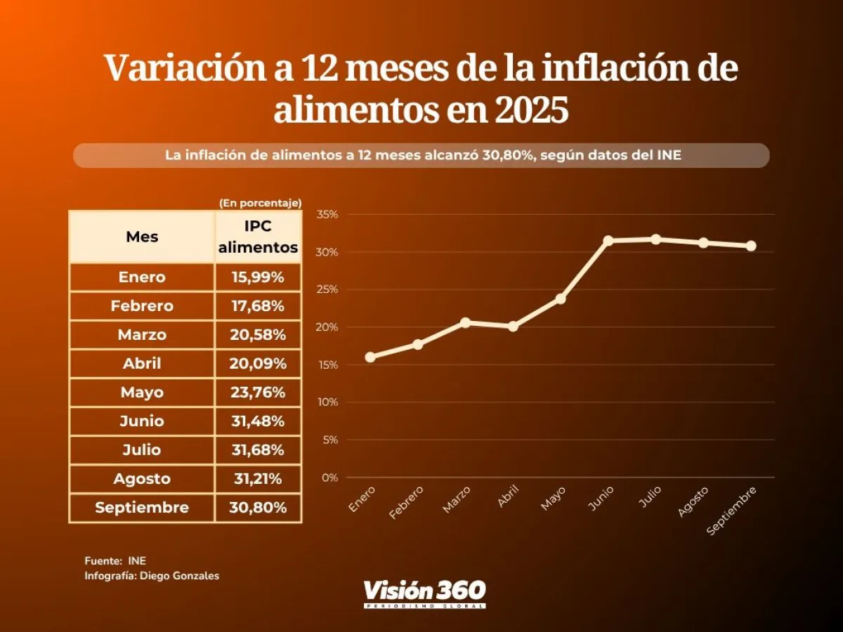 La inflación a 12 meses de los alimentos se sitúa en 30,80% y permanece alta, a pesar de una leve desaceleración con relación al período junio-agosto, cuando el índice estuvo encima del 31%, según revelan los datos del Instituto Nacional de Estadística (INE).