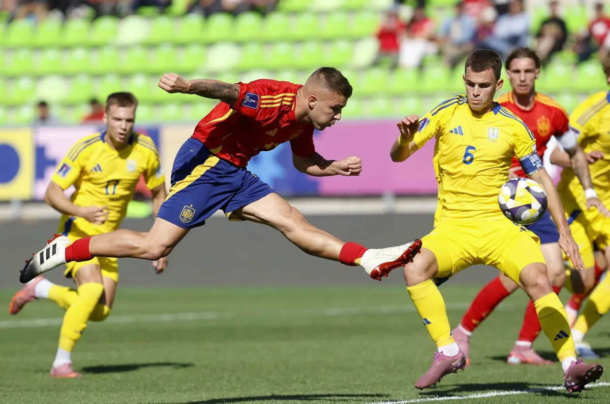 Los españoles asediaron la portería ucraniana en el primer tiempo y finalmente lograron abrir el marcador a mitad de camino. Tras un córner corto con Jan Virgili, García irrumpió en el área, donde fue encontrado por Rodrigo Mendoza. Tocó el balón con la izquierda antes de elevarlo por encima de Vladyslav Krapyvtsov.
