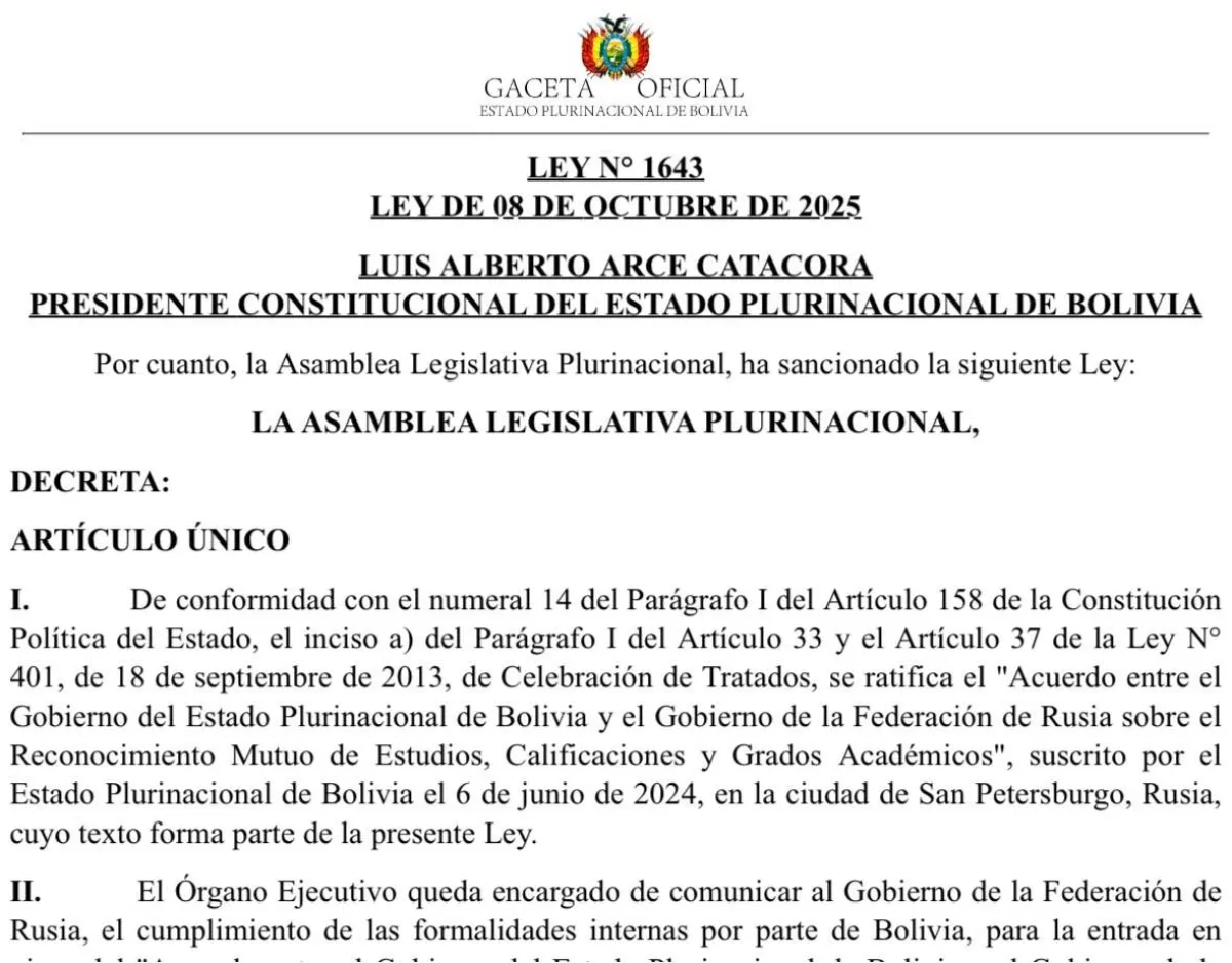 Bolivia promulga ley que ratifica acuerdo con Rusia de reconocimiento mutuo de estudios, calificaciones y grados académicos