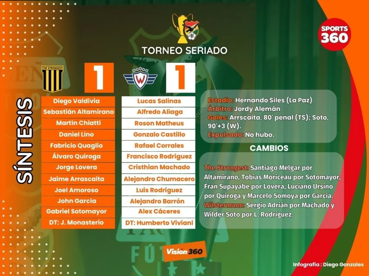 Con un polémico penal, que Jaime Arrascaita cambió por gol, The Strongest se adelantó en el marcador —80 minutos—, pero cuando todo apuntaba a que los tres puntos se quedaban en casa, en una jugada confusa en el área, Wilder Soto anotó el empate a los 93 minutos.