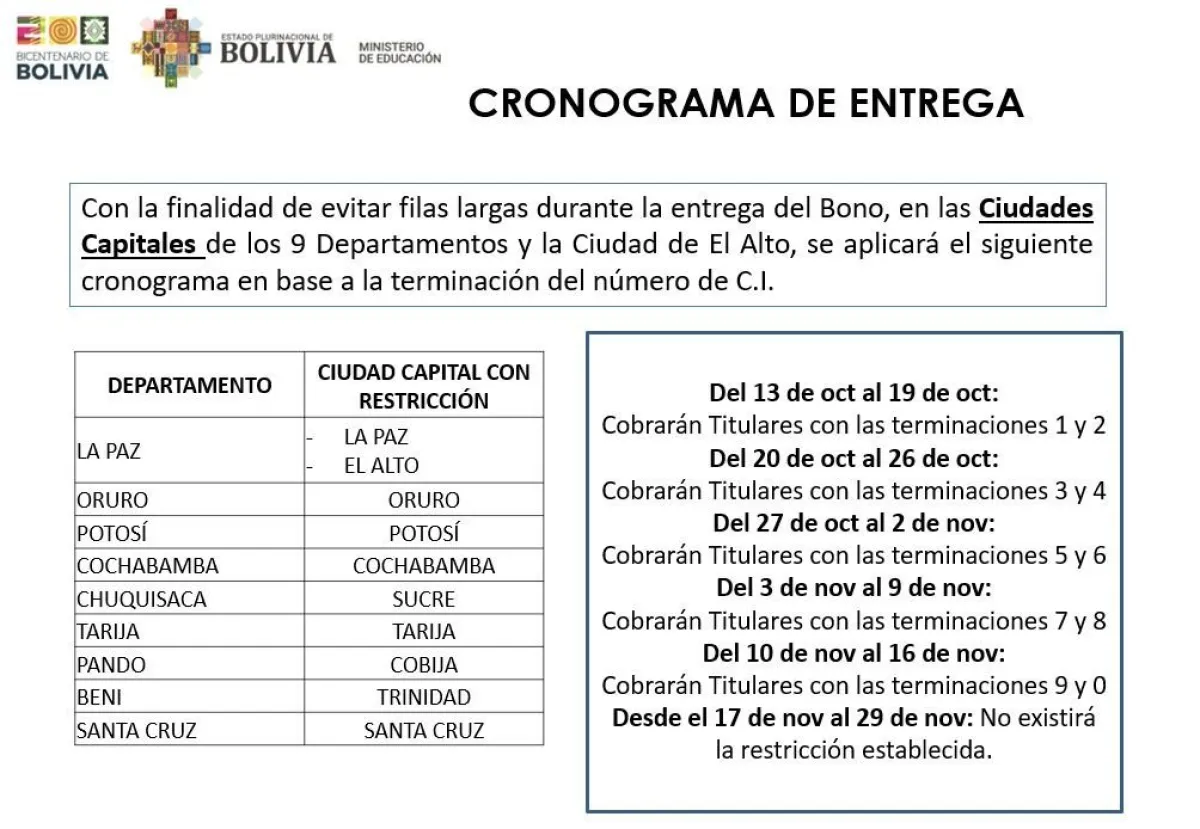 Este lunes 13 de octubre comienza el pago del bono Juancito Pinto en el país y para ello el Ministerio de Educación definió un cronograma según la terminación de la cédula de identidad del padre, madre o tutor.