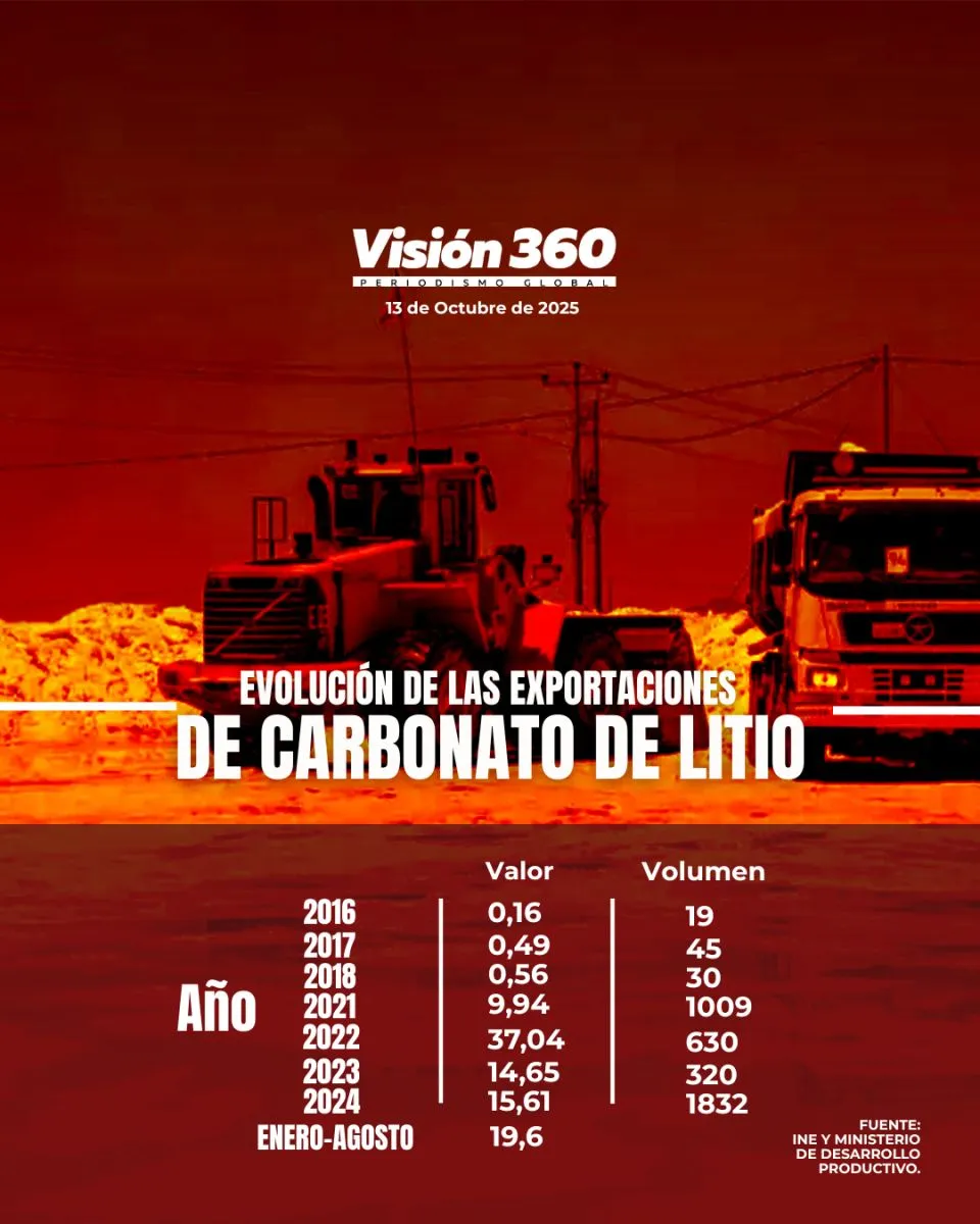 Entre enero y agosto, Bolivia exportó carbonato de litio por un valor de 19,6 millones de dólares, cifra distante de los más de mil millones de dólares que Chile vendió al mundo o los cerca de 500 millones de dólares que comercializa Argentina.