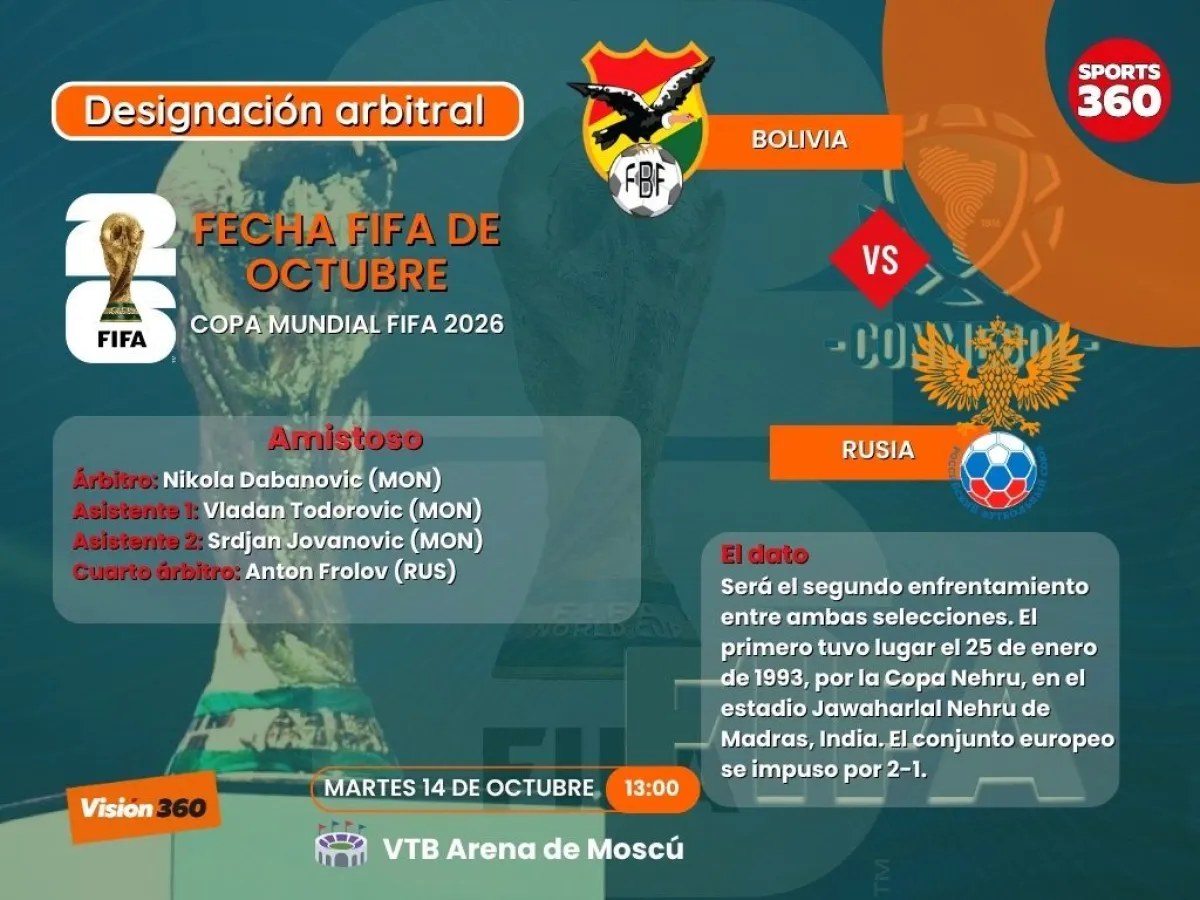 La Selección boliviana enfrentará a Rusia este martes, desde las 13:00 (hora boliviana), en el estadio VTB Arena de Moscú, en el segundo partido de preparación con miras al repechaje internacional de la FIFA, que se disputará en marzo en México.
