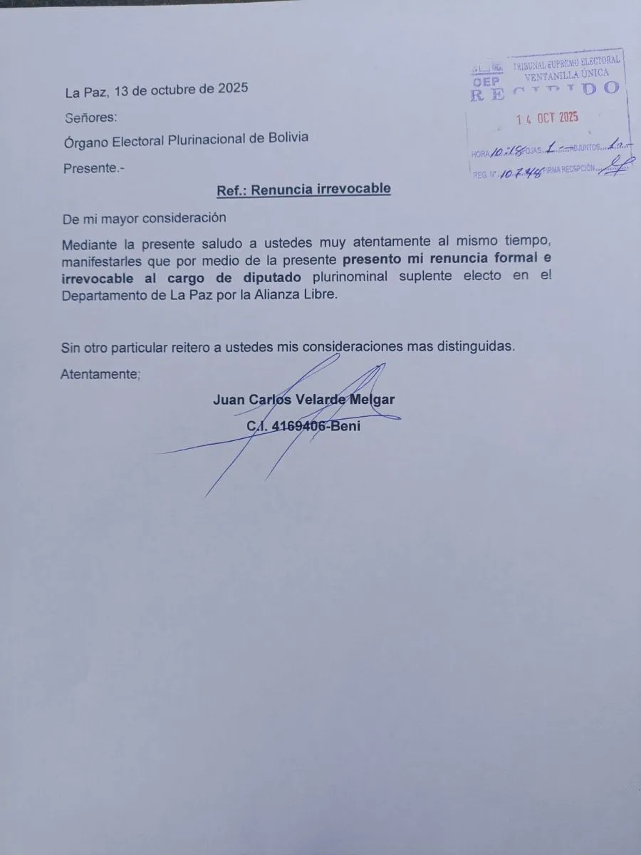 Este martes, el diputado suplente electo por la Alianza Libre, Juan Carlos Velarde, presentó oficialmente ante el Tribunal Supremo Electoral (TSE) su renuncia irrevocable a la diputación obtenida en las elecciones generales del 17 de agosto. La causa de su renuncia fue el escándalo generado por expresiones consideradas racistas que emitió en un video difundido en redes sociales.