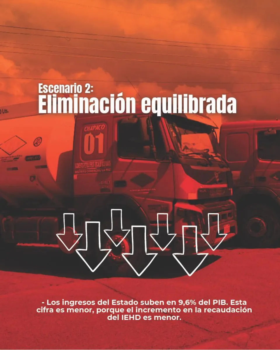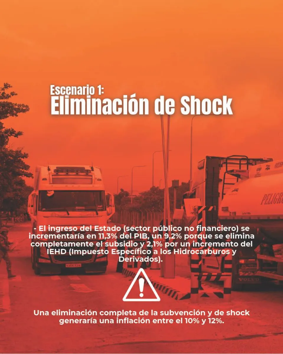 - El ingreso del Estado (sector público no financiero) se incrementaría en 11,3% del PIB, un 9,2% porque se elimina completamente el subsidio y 2,1% por un incremento del IEHD (Impuesto Específico a los Hidrocarburos y Derivados). Una eliminación completa de la subvención y de shock generaría una inflación entre el 10% y 12%.