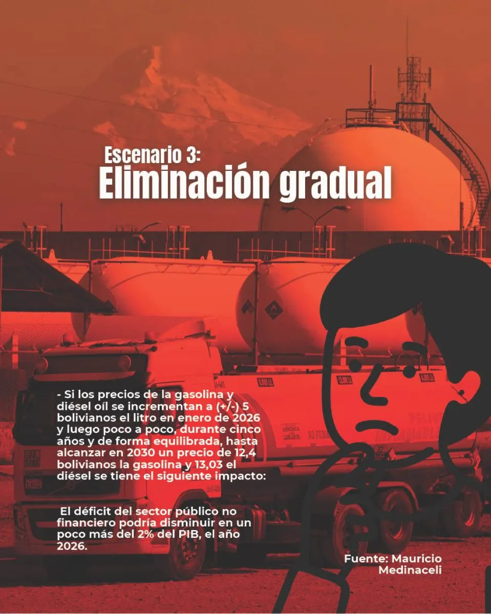 Medinaceli en su análisis asegura que ya sea de manera gradual y mediante una política de shock, el subsidio disminuye con diferentes impactos en los ingresos fiscales, en la reducción del déficit fiscal y en el incremento de la inflación. Estos son los escenarios que plantea: