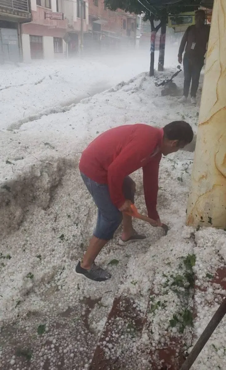 La Alcaldía tuvo que desplegar palas cargadoras y volquetas para sacar el granizo acumulado. El temporal arrasó con cultivos de papa y maíz en al menos cuatro comunidades.
