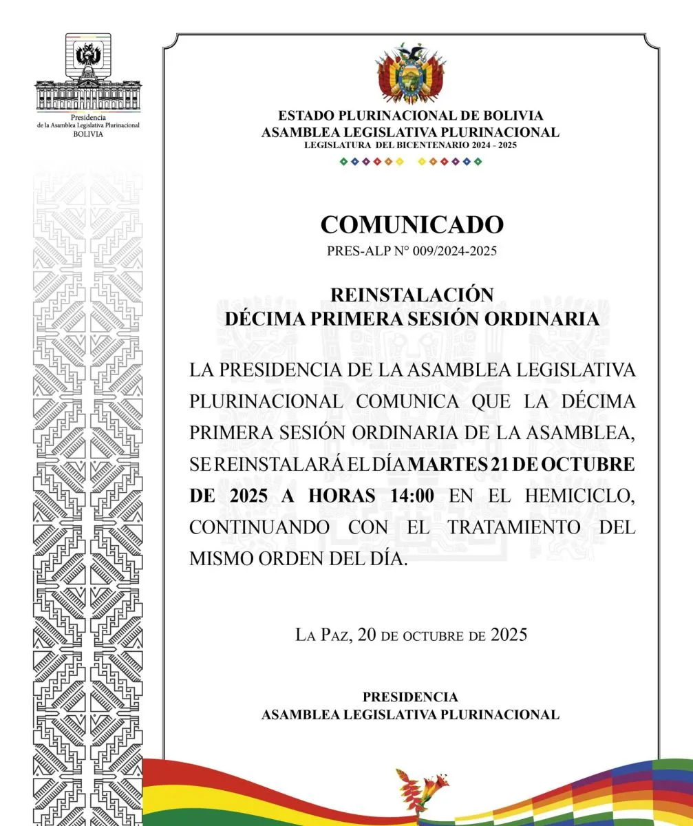 “La décima primera sesión ordinaria de la Asamblea se reinstalará este martes 21 de octubre a las 14.00 en el Hemiciclo, continuando con el tratamiento del mismo orden del día”, señala la convocatoria oficial difundida este lunes.