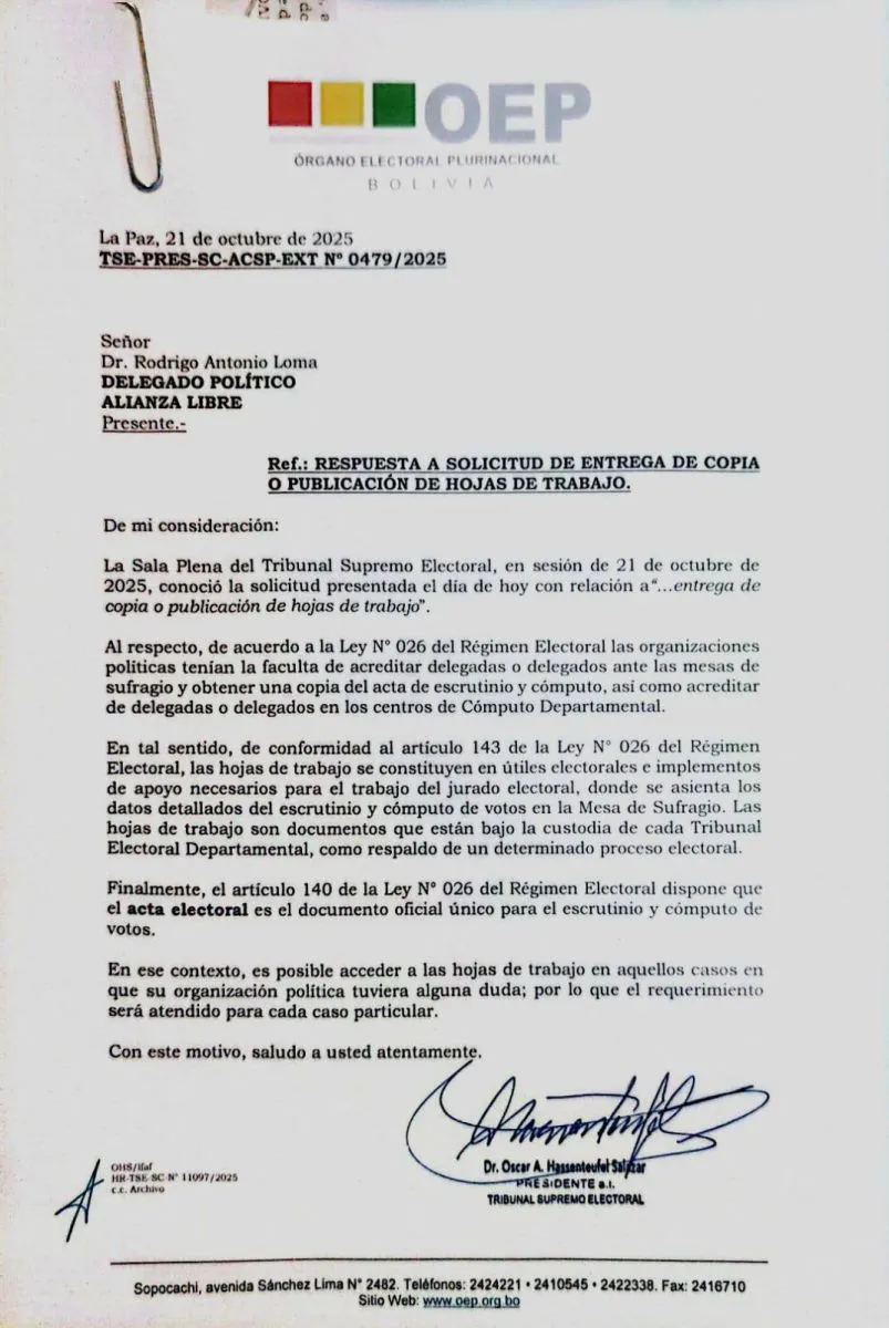 El Tribunal Supremo Electoral (TSE) accedió este martes a entregar las imágenes de las 34.026 actas de votación a la Alianza Libre. La decisión responde a una solicitud formal realizada el mismo día por el jefe de campaña de la fuerza, Luis Vásquez. Sin embargo, mediante dos cartas formales, el tribunal recordó que cualquier ciudadano puede acceder a sus sistemas para comprobar los datos.