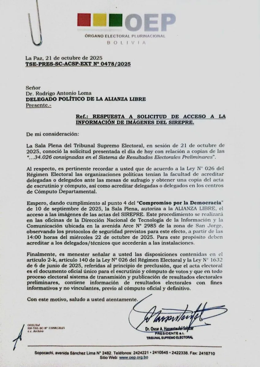 "La Sala Plena autoriza a la Alianza Libre el acceso a las imágenes de las actas del Sistema de Resultados Preliminares (Sirepre) (...) Para este propósito deberán acreditar a los delegados/técnicos que accederán a las instalaciones", indican los documentos, que también fueron difundidos en las cuentas oficiales de redes sociales del ente electoral.