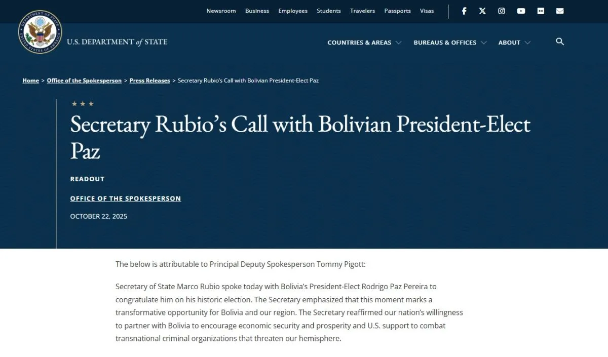 “El secretario de Estado, Marco Rubio, conversó hoy con el presidente electo de Bolivia, Rodrigo Paz Pereira para felicitarlo por su histórica elección. El Secretario destacó que este momento representa una oportunidad transformadora para Bolivia y para nuestra región”, expresó Tommy Pigott, portavoz principal adjunto.