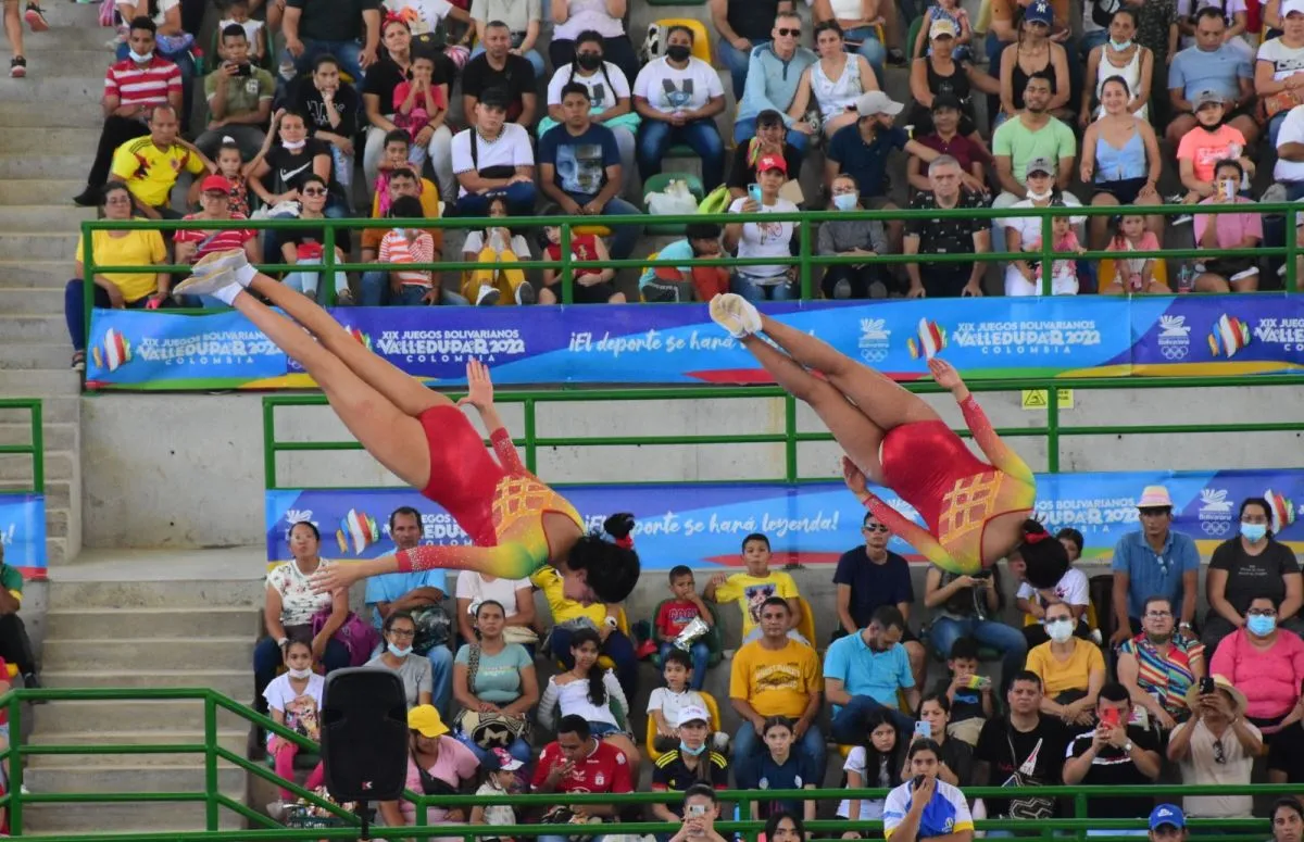 Dos gimnastas nacionales en la prueba de trampolín en los Juegos de 2022. Foto: Valledupar 2022.