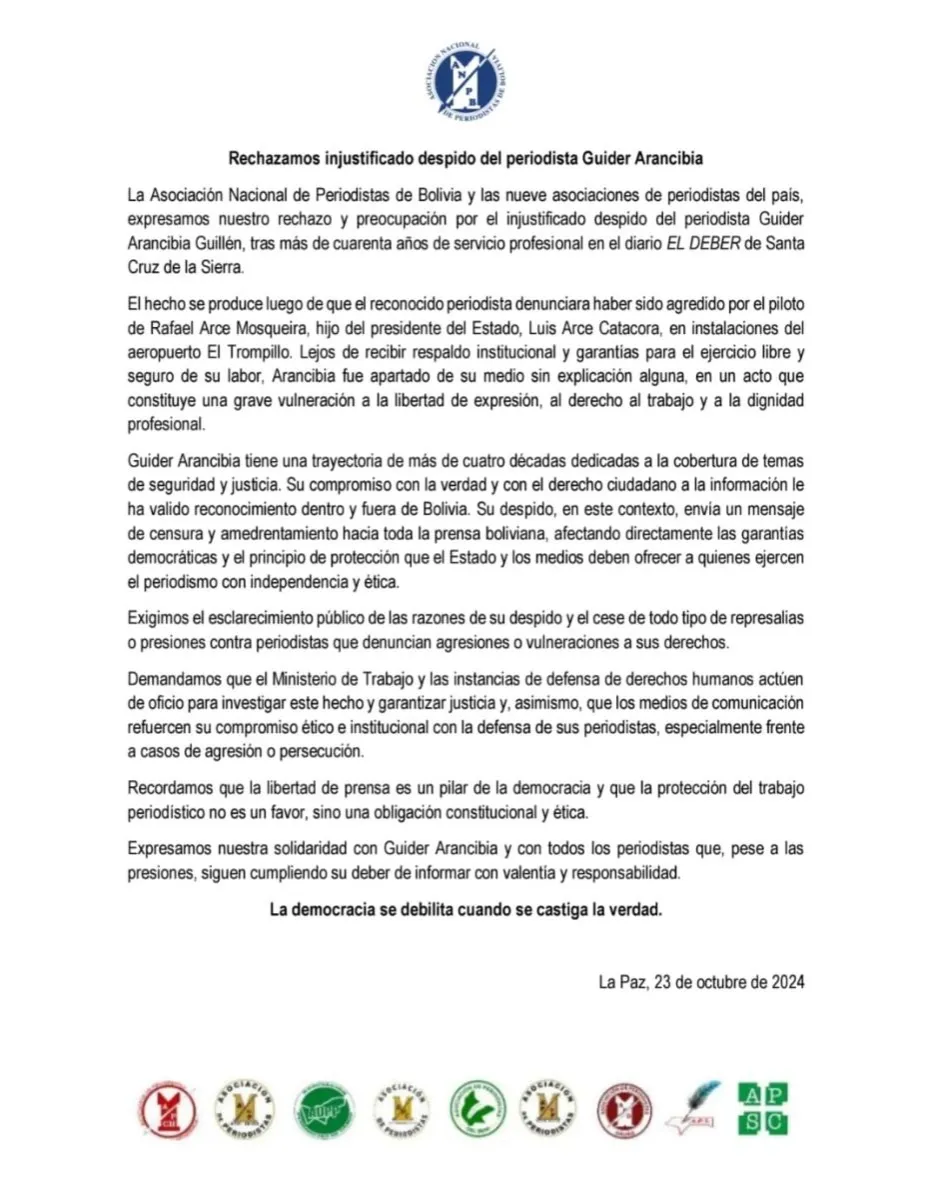 "La Asociación Nacional de Periodistas de Bolivia y las nueve asociaciones de periodistas del país expresamos nuestro rechazo y preocupación por el injustificado despido del periodista Guider Arancibia Guillén, tras más de cuarenta años de servicio profesional en el diario EL DEBER de Santa Cruz de la Sierra", indica el comunicado.