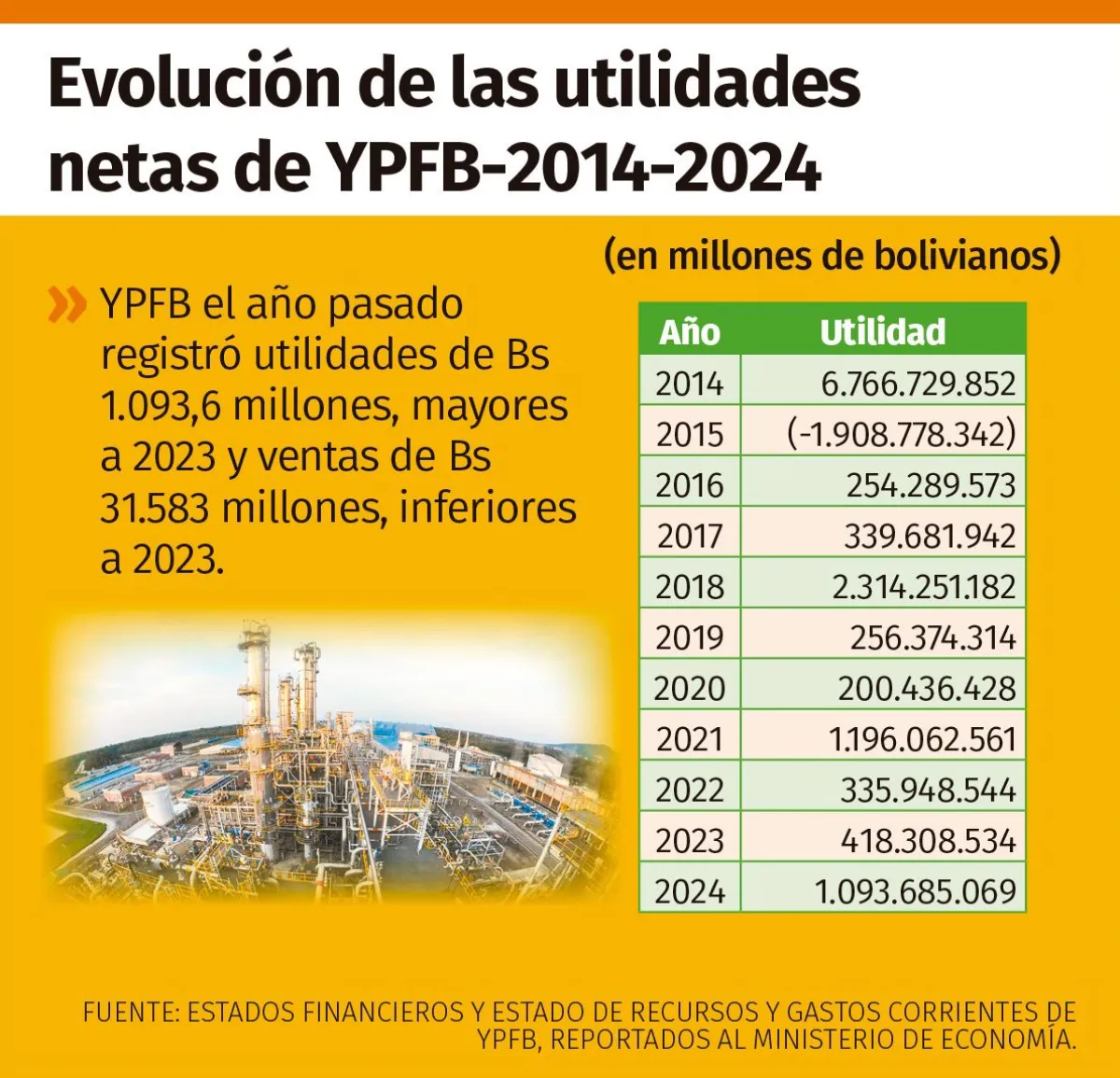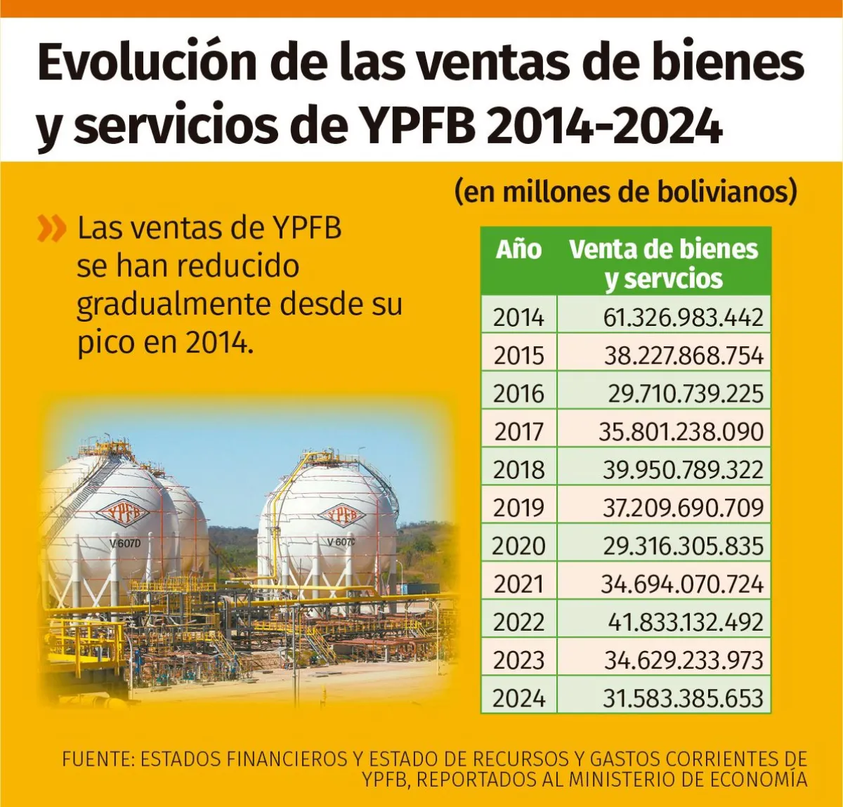 Sin embargo, en 2014, la ganancia neta de la compañía era de 6.766 millones de bolivianos (93,8% más que la registrada en 2024) y los ingresos por ventas llegaban a 61.326 millones de bolivianos (48,5% más).