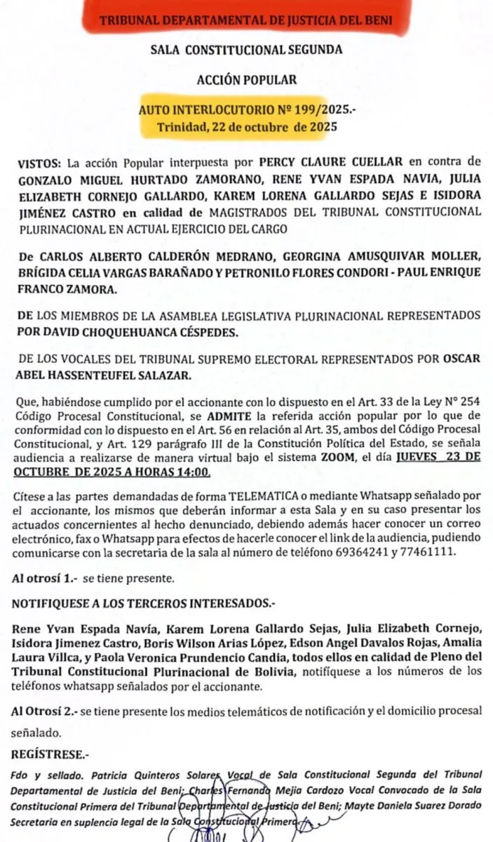 Una acción popular presentada en Beni que busca la suspensión de los magistrados “auto prorrogados”, así como de las autoridades que fueron elegidas en las elecciones judiciales de diciembre de 2024.
