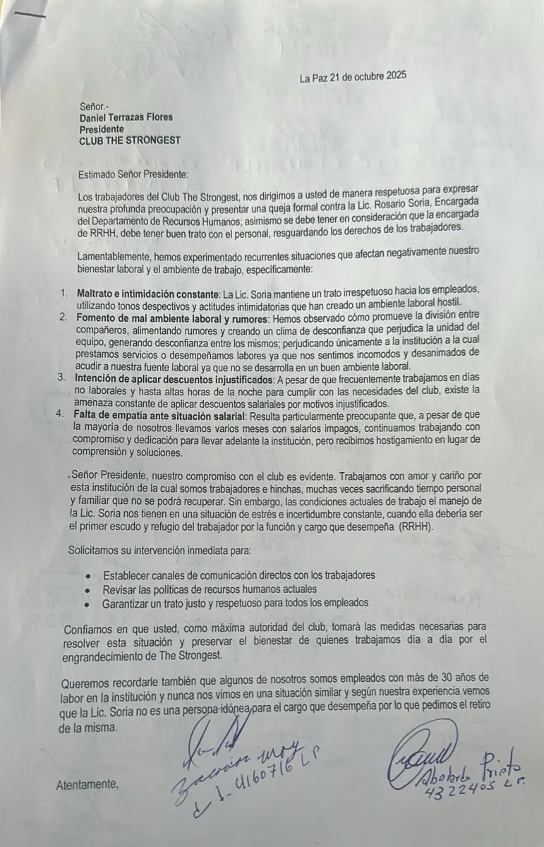 En los últimos días, empleados de diferentes áreas del club, a través de una carta enviada al presidente Terrazas, denunciaron malos tratos de parte de Rosario Soria, la encargada de Recursos Humanos, que fue puesta en el cargo por el titular atigrado, de acuerdo a lo que se informó.