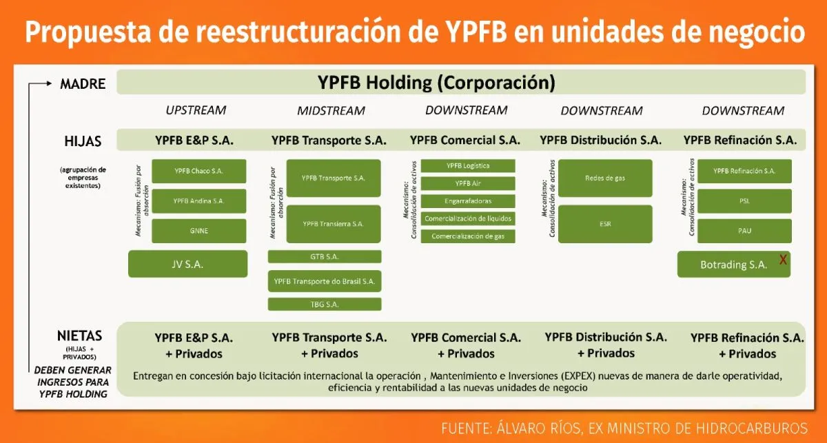 La propuesta del experto es la creación de un YPFB Holding (Corporación) con 5 unidades de negocio: YPFB E&P, Transporte, Comercial, Distribución, Refinación, las cuales pueden asociarse y crear empresas nietas con socios privados para operación y otros.