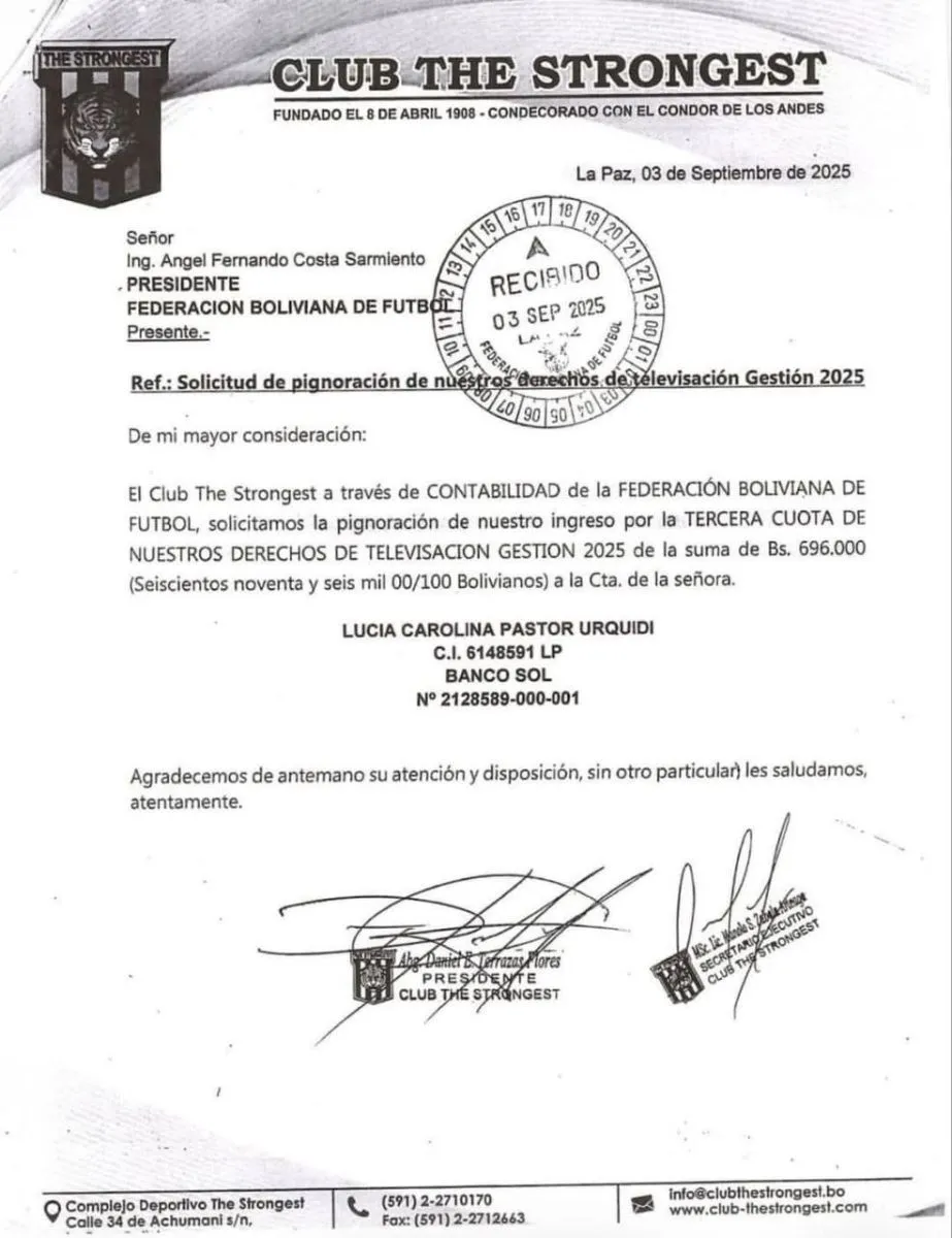 El comité ejecutivo del club The Strongest denunció que el presidente de esta entidad Daniel Terrazas designó como directora, de forma unilateral, a Lucia Carolina Pastor Urquidi a la que posteriormente se le pignoró medio millón de bolivianos sin ningún tipo de autorización del directorio que se encuentra en vigencia.