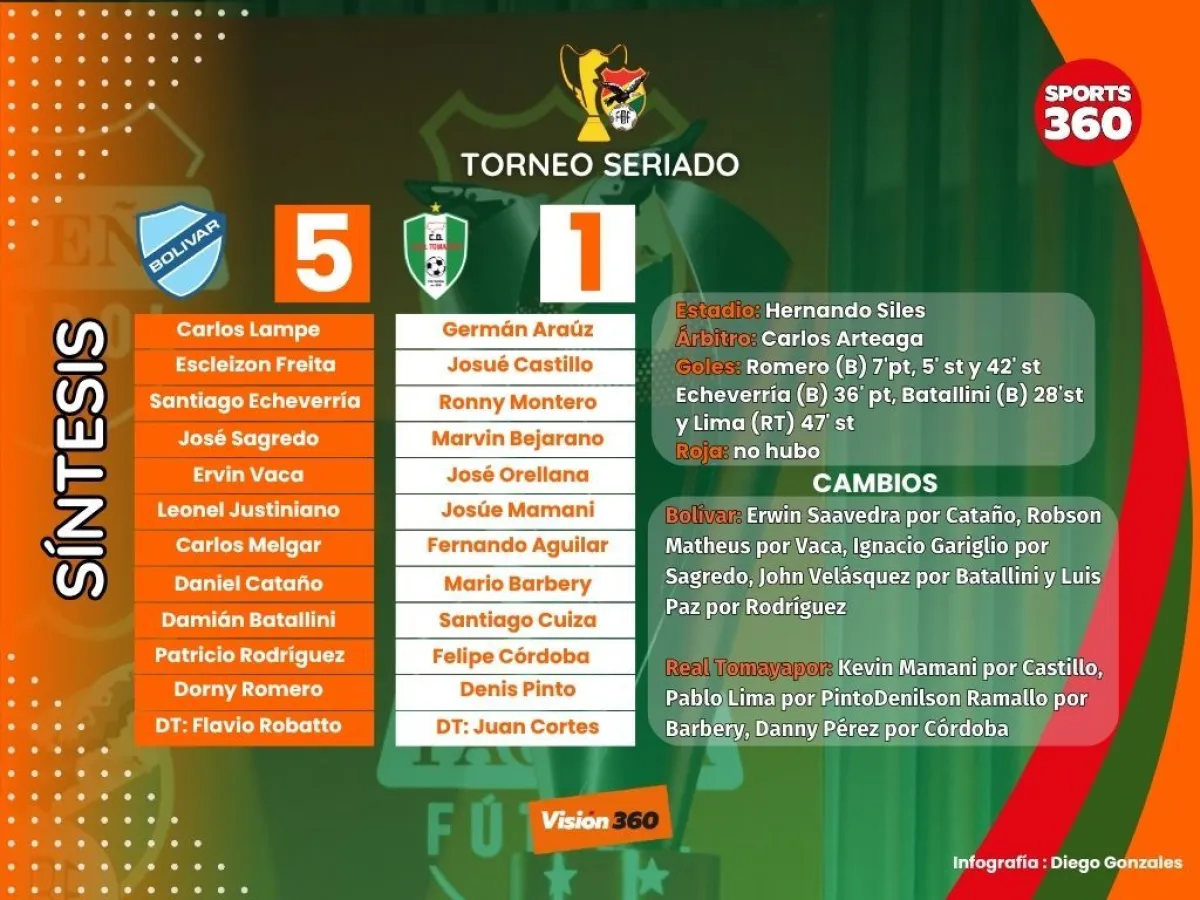 Bolívar apabulló a Real Tomayapo por 5-1 en el estadio Hernando Siles y pasó a comandar la punta del Grupo A del torneo seriado con 20 puntos, dos más que Blooming con el que lucha el primer lugar.
