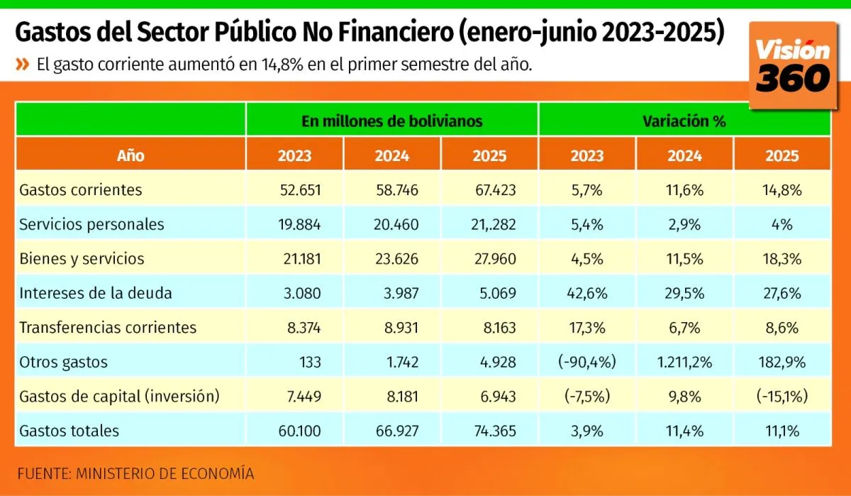 Los gastos corrientes, hasta junio, alcanzaron 67.423 millones de bolivianos, un 14,8% respecto al mismo período de 2024.