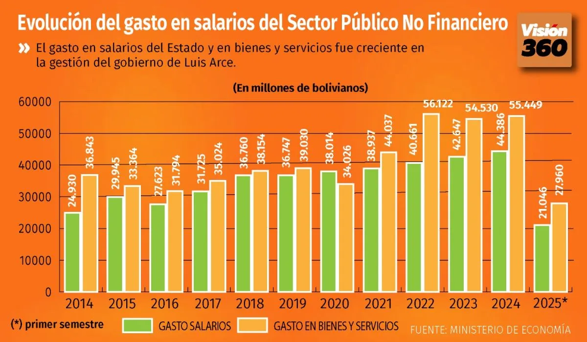 Durante el gobierno de Luis Arce (2021-2025), este gasto pasó de 38.937 millones de bolivianos a 44.386 millones de bolivianos en 2024 y al primer semestre de 2025 suma 21.046 millones de bolivianos (Ver cuadro).