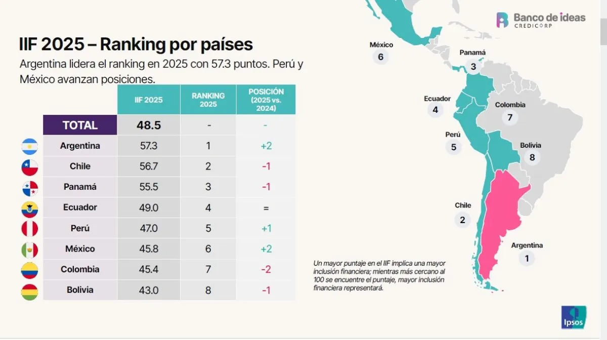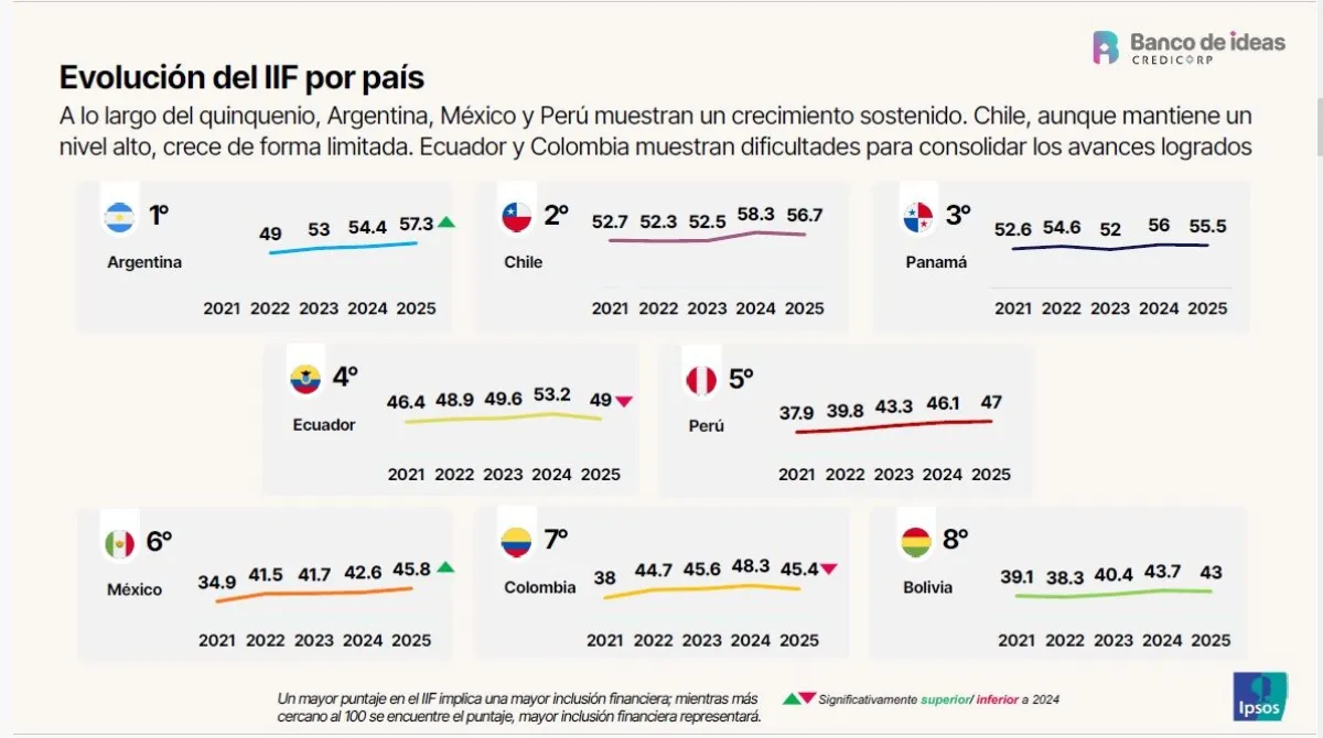 El IIF es un estudio que forma parte del Banco de Ideas del holding Credicorp y que desde hace cinco años mide los niveles de acceso, uso y calidad percibida del sistema financiero en Argentina, Bolivia, Colombia, Chile, Ecuador, México, Panamá y Perú. Para elaborar el último fueron entrevistados, en mayo de este año, 13.455 habitantes de todos estos países.