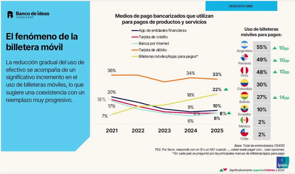 A nivel latinoamericano, la cantidad de usuarios que posee una billetera digital se cuadruplicó, al pasar de 11 % en 2021 a 43 % en 2025, un incremento de 32 puntos porcentuales. En el caso de Bolivia, se estableció que este año el 46% posee billeteras móviles o aplicaciones de pago  digital, tres veces más que en 2021, cuando llegaban al 15%.