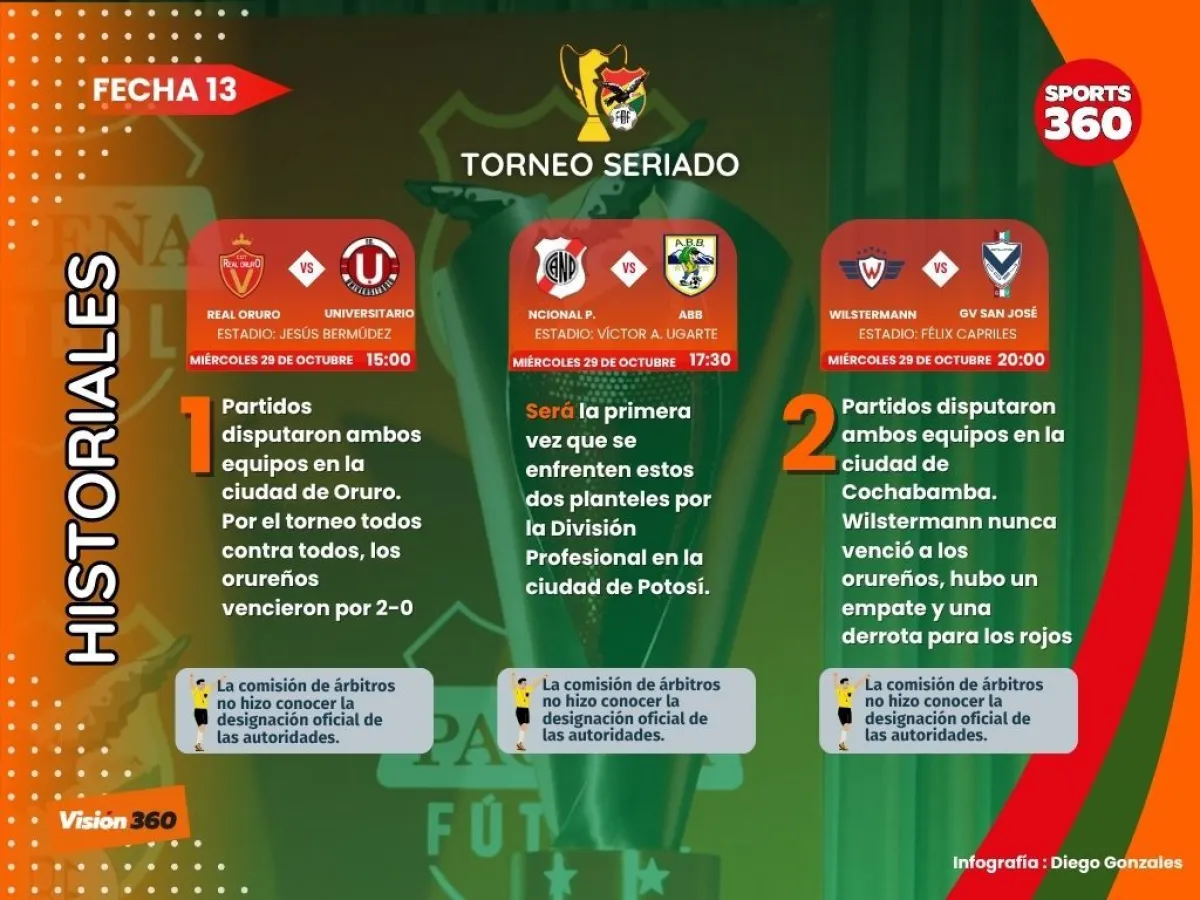La fecha 13 del torneo seriado arrancará a las 15:00 en el Jesús Bermúdez. Nacional recibe a ABB en Potosí y Wilstermann será local ante el representativo de GV San José.