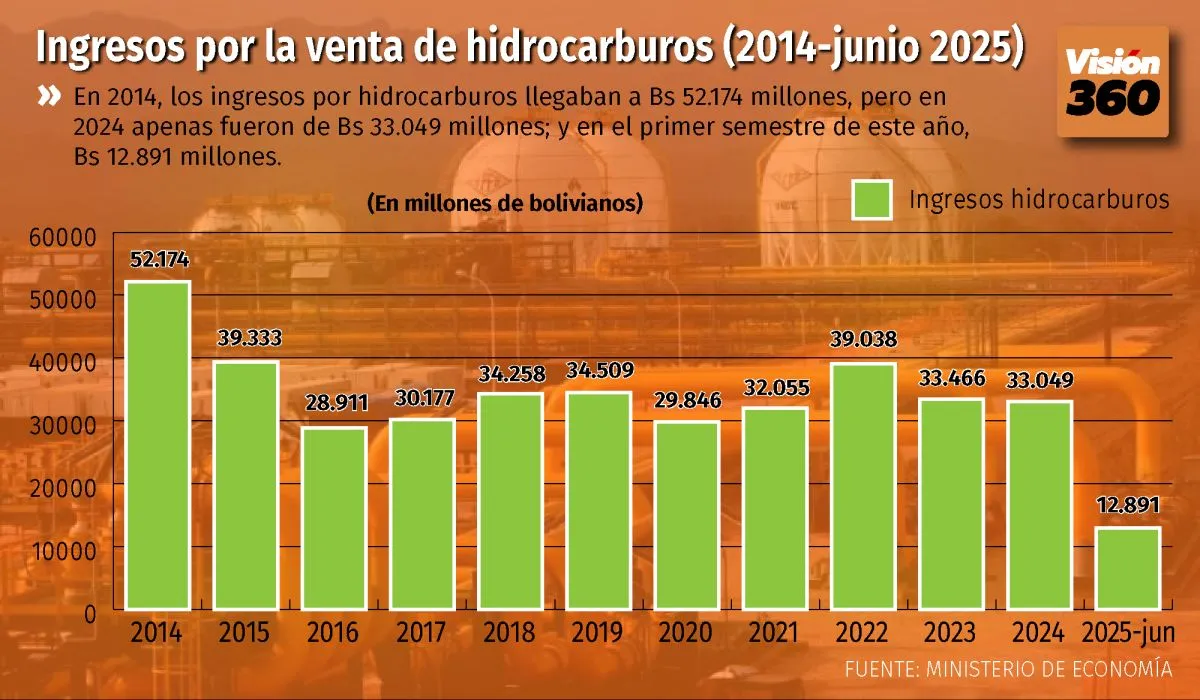 Bolivia, en 2014, llegó a tener 52.174 millones de bolivianos de ingresos por hidrocarburos; luego de 10 años y seis meses, en el primer semestre de 2025, estos recursos generados por la que era la principal fuente de riqueza del país, apenas suman 12.881 millones de bolivianos, según datos del Ministerio de Economía.
