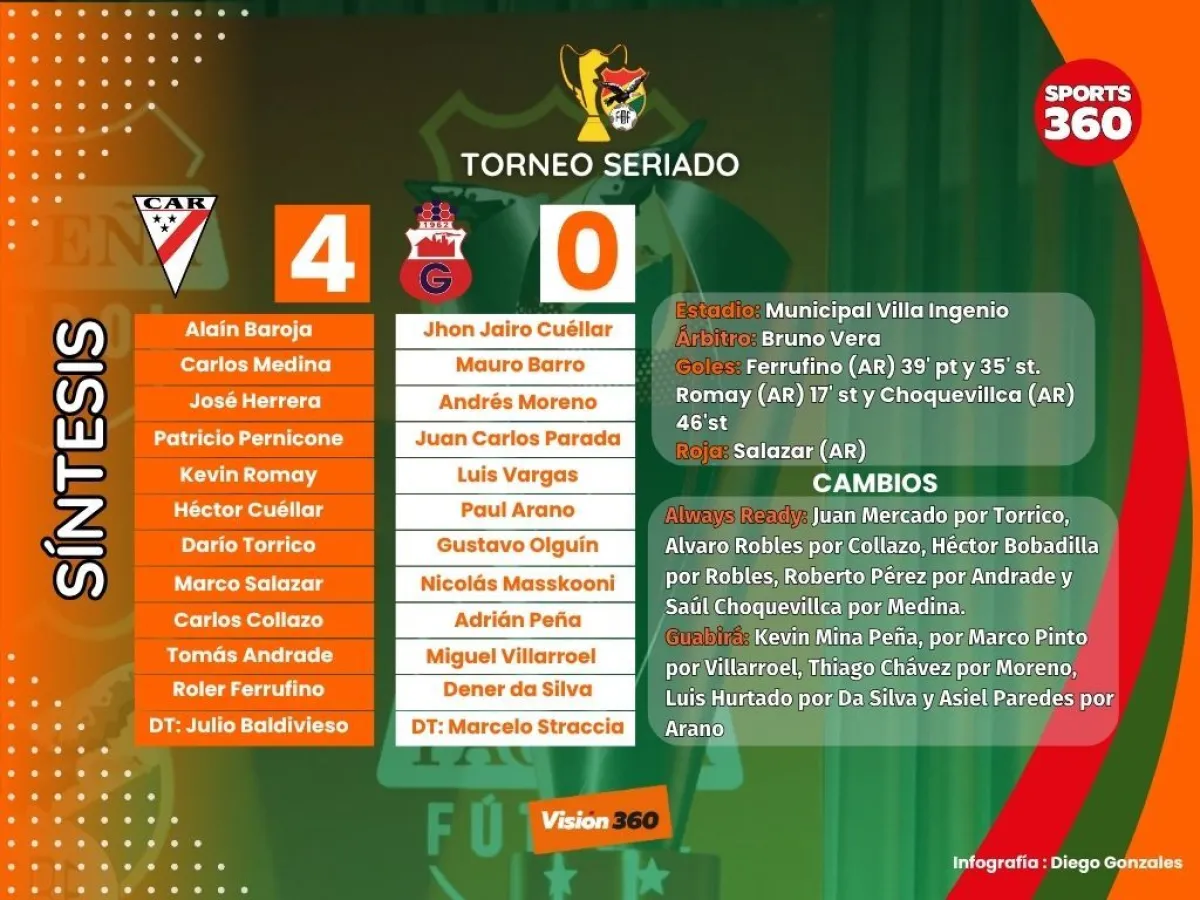 Always Ready impidió que Guabirá asegure su clasificación como primero de su serie en el encuentro que le ganó por 4-0, en el estadio de Villa Ingenio, por la fecha 13 del torneo seriado.